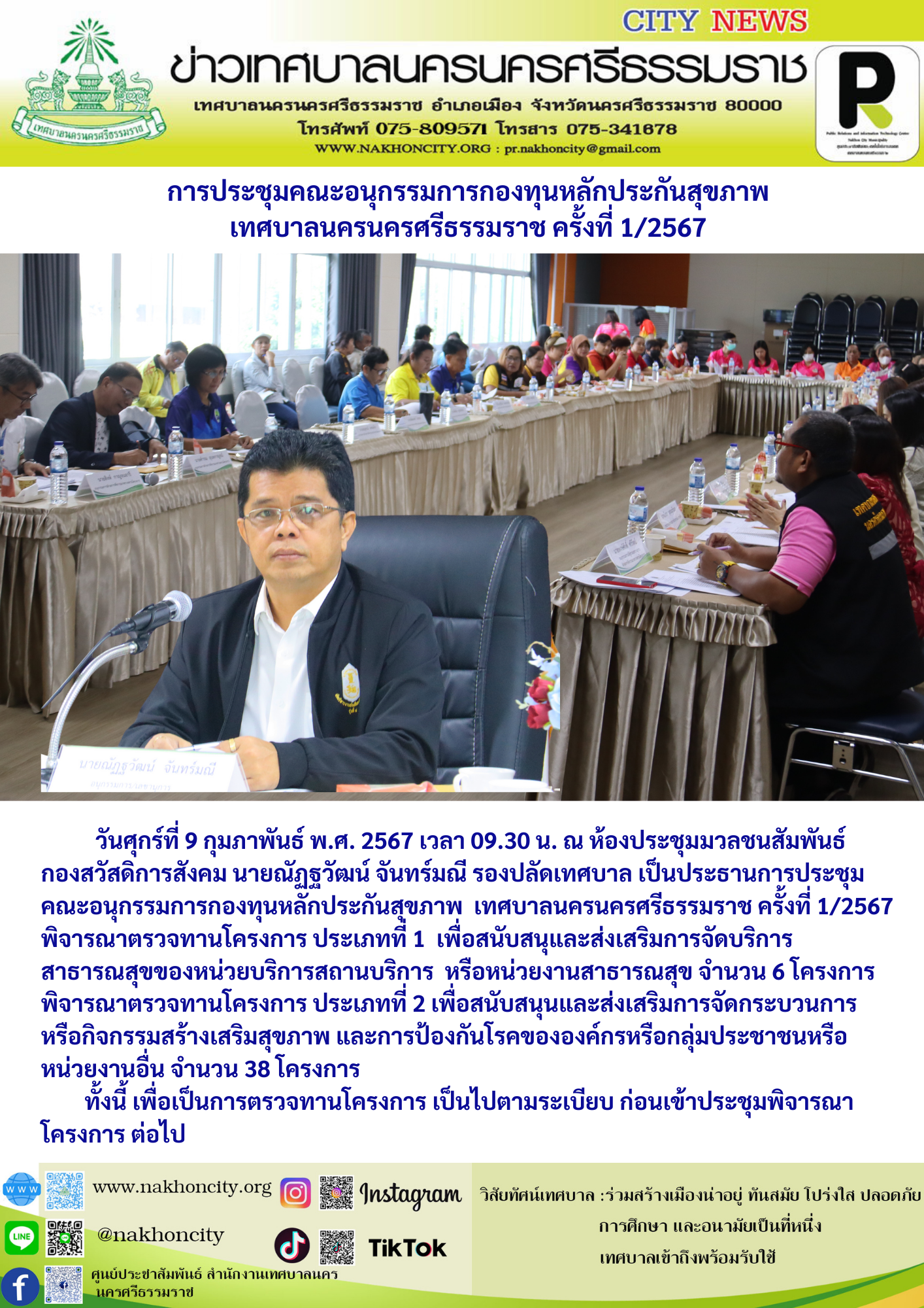 | วันศุกร์ที่ 9 กุมภาพันธ์ พ.ศ. 2567 เวลา 09.30 น. ณ ห้องประชุมมวลชนสัมพันธ์ กองสวัสดิการสังคม นายณัฏฐวัฒน์ จันทร์มณี รองปลัดเทศบาล เป็นประธานการประชุมคณะอนุกรรมการกองทุนหลักประกันสุขภาพ เทศบาลนครนครศรีธรรมราช ครั้งที่ 1/2567 พิจารณาตรวจทานโครงการ ประเภทที่ 1 เพื่อสนับสนุและส่งเสริมการจัดบริการสาธารณสุขของหน่วยบริการสถานบริการ หรือหน่วยงานสาธารณสุข จำนวน 6 โครงการ พิจารณาตรวจทานโครงการ ประเภทที่ 2 เพื่อสนับสนุนและส่งเสริมการจัดกระบวนการหรือกิจกรรมสร้างเสริมสุขภาพ และการป้องกันโรคขององค์กรหรือกลุ่มประชาชนหรือหน่วยงานอื่น จำนวน 38 โครงการ ทั้งนี้ เพื่อเป็นการตรวจทานโครงการ เป็นไปตามระเบียบ ก่อนเข้าประชุมพิจารณาโครงการ ต่อไป