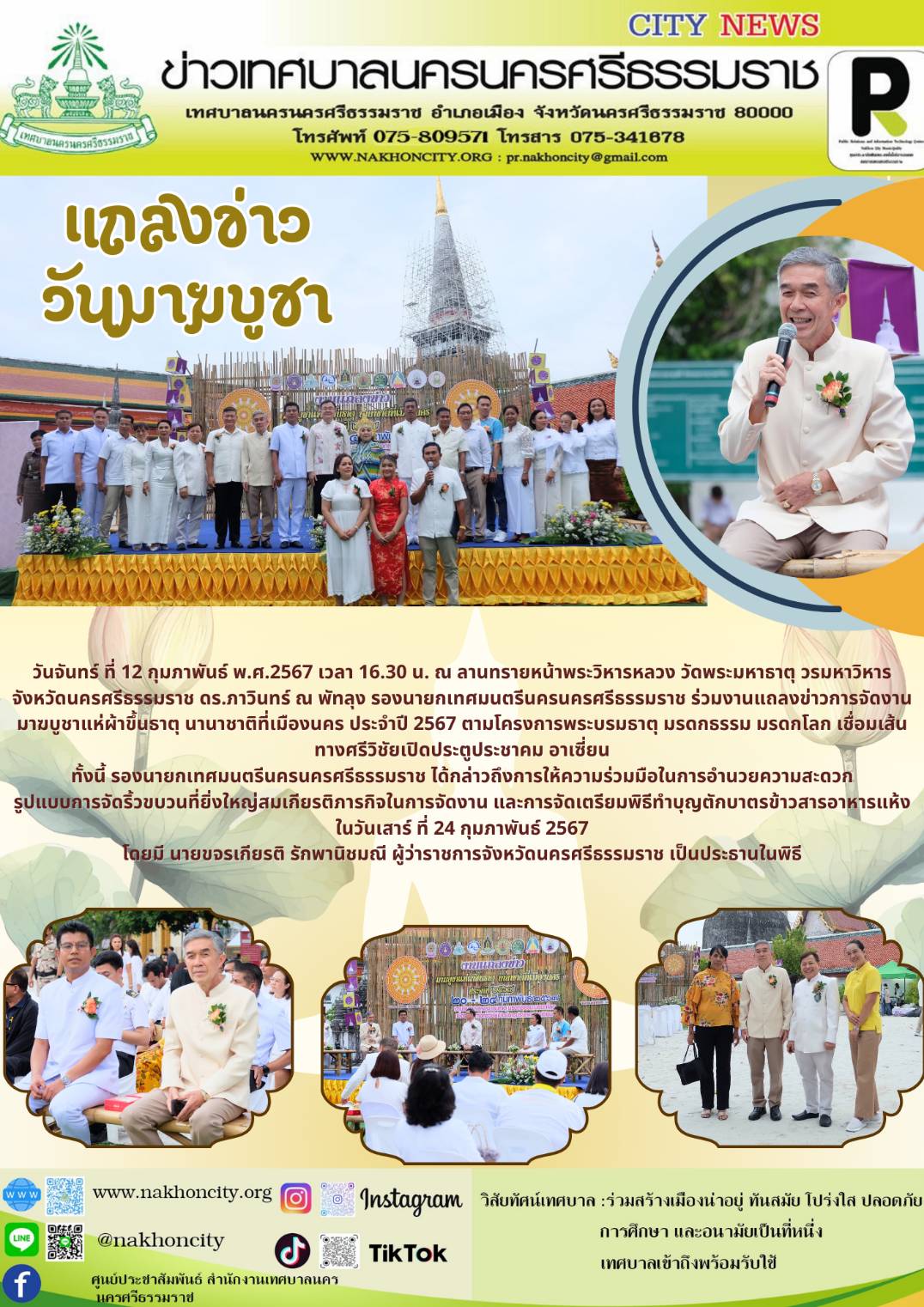 | วันจันทร์ ที่ 12 กุมภาพันธ์ พ.ศ.2567 เวลา 16.30 น. ณ ลานทรายหน้าพระวิหารหลวง วัดพระมหาธาตุ วรมหาวิหาร จังหวัดนครศรีธรรมราช ดร.ภาวินทร์ ณ พัทลุง รองนายกเทศมนตรีนครนครศรีธรรมราช ร่วมงานแถลงข่าวการจัดงานมาฆบูชาแห่ผ้าขึ้นธาตุ นานาชาติที่เมืองนคร ประจำปี 2567 ตามโครงการพระบรมธาตุ มรดกธรรม มรดกโลก เชื่อมเส้นทางศรีวิชัยเปิดประตูประชาคม อาเซี่ยน ทั้งนี้ รองนายกเทศมนตรีนครนครศรีธรรมราช ได้กล่าวถึงการให้ความร่วมมือในการอำนวยความสะดวก รูปแบบการจัดริ้วขบวนที่ยิ่งใหญ่สมเกียรติภารกิจในการจัดงาน และการจัดเตรียมพิธีทำบุญตักบาตรข้าวสารอาหารแห้ง ในวันเสาร์ ที่ 24 กุมภาพันธ์ 2567 โดยมี นายขจรเกียรติ รักพานิชมณี ผู้ว่าราชการจังหวัดนครศรีธรรมราช เป็นประธานในพิธี ............... ภาพ//ข่าว//จันทร์จิรา |