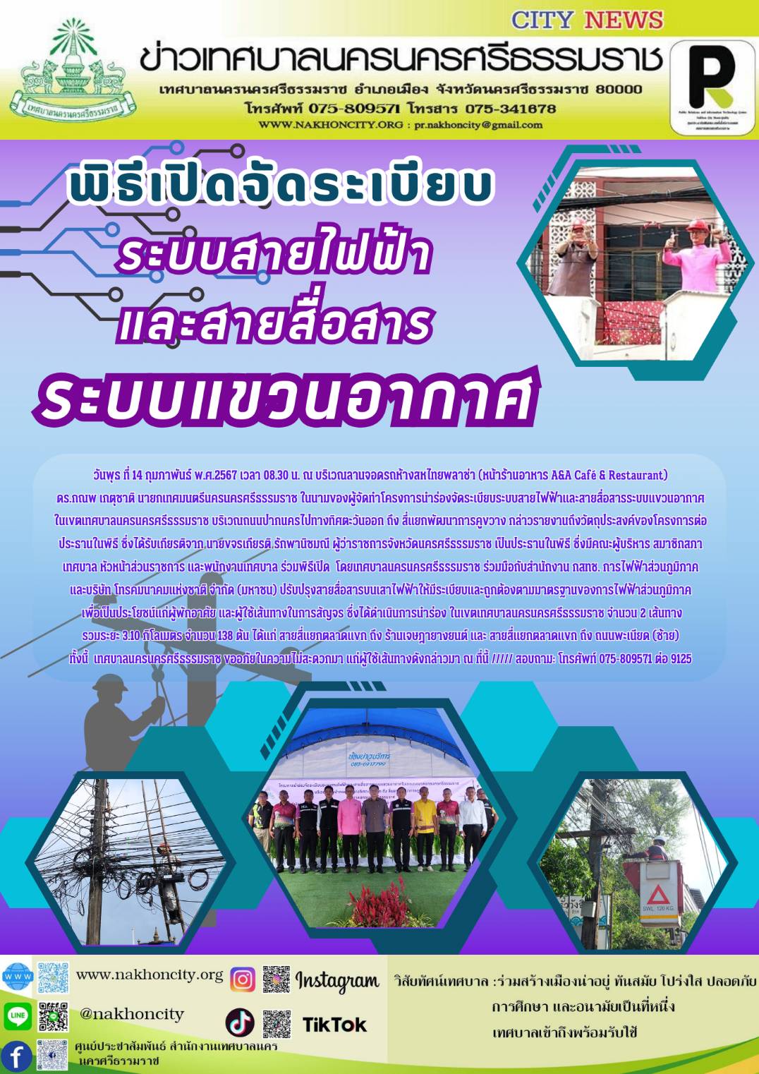 | วันพุธ ที่ 14 กุมภาพันธ์ พ.ศ.2567 เวลา 08.30 น. ณ บริเวณลานจอดรถห้างสหไทยพลาซ่า (หน้าร้านอาหาร A&A Café & Restaurant) ดร.กณพ เกตุชาติ นายกเทศมนตรีนครนครศรีธรรมราช ในนามของผู้จัดทำโครงการนำร่องจัดระเบียบระบบสายไฟฟ้าและสายสื่อสารระบบแขวนอากาศในเขตเทศบาลนครนครศรีธรรมราช บริเวณถนนปากนครไปทางทิศตะวันออก ถึง สี่แยกพัฒนาการคูขวาง กล่าวรายงานถึงวัตถุประสงค์ของโครงการต่อประธานในพิธี ซึ่งได้รับเกียรติจาก นายขจรเกียรติ รักพานิชมณี ผู้ว่าราชการจังหวัดนครศรีธรรมราช เป็นประธานในพิธี ซึ่งมีคณะผู้บริหาร สมาชิกสภาเทศบาล หัวหน้าส่วนราชการ และพนักงานเทศบาล ร่วมพิธีเปิด โดยเทศบาลนครนครศรีธรรมราช ร่วมมือกับสำนักงาน กสทช. การไฟฟ้าส่วนภูมิภาค และบริษัท โทรคมนาคมแห่งชาติ จำกัด (มหาชน) ปรับปรุงสายสื่อสารบนเสาไฟฟ้าให้มีระเบียบและถูกต้องตามมาตรฐานของการไฟฟ้าส่วนภูมิภาค เพื่อเป็นประโยชน์แก่ผู้พักอาศัย และผู้ใช้เส้นทางในการสัญจร ซึ่งได้ดำเนินการนำร่อง ในเขตเทศบาลนครนครศรีธรรมราช จำนวน 2 เส้นทาง รวมระยะ 3.10 กิโลเมตร จำนวน 138 ต้น ได้แก่ สายสี่แยกตลาดแขก ถึง ร้านเจษฎายางยนต์ และ สายสี่แยกตลาดแขก ถึง ถนนพะเนียด (ซ้าย) ทั้งนี้ เทศบาลนครนครศรีธรรมราช ขออภัยในความไม่สะดวกมา แก่ผู้ใช้เส้นทางดังกล่าวมา ณ ที่นี้ ///// สอบถาม: โทรศัพท์ 075-809571 ต่อ 9125 .............. ภาพ//ข่าว//จันทร์จิรา ตรวจทาน//ฐิตินันท์ |