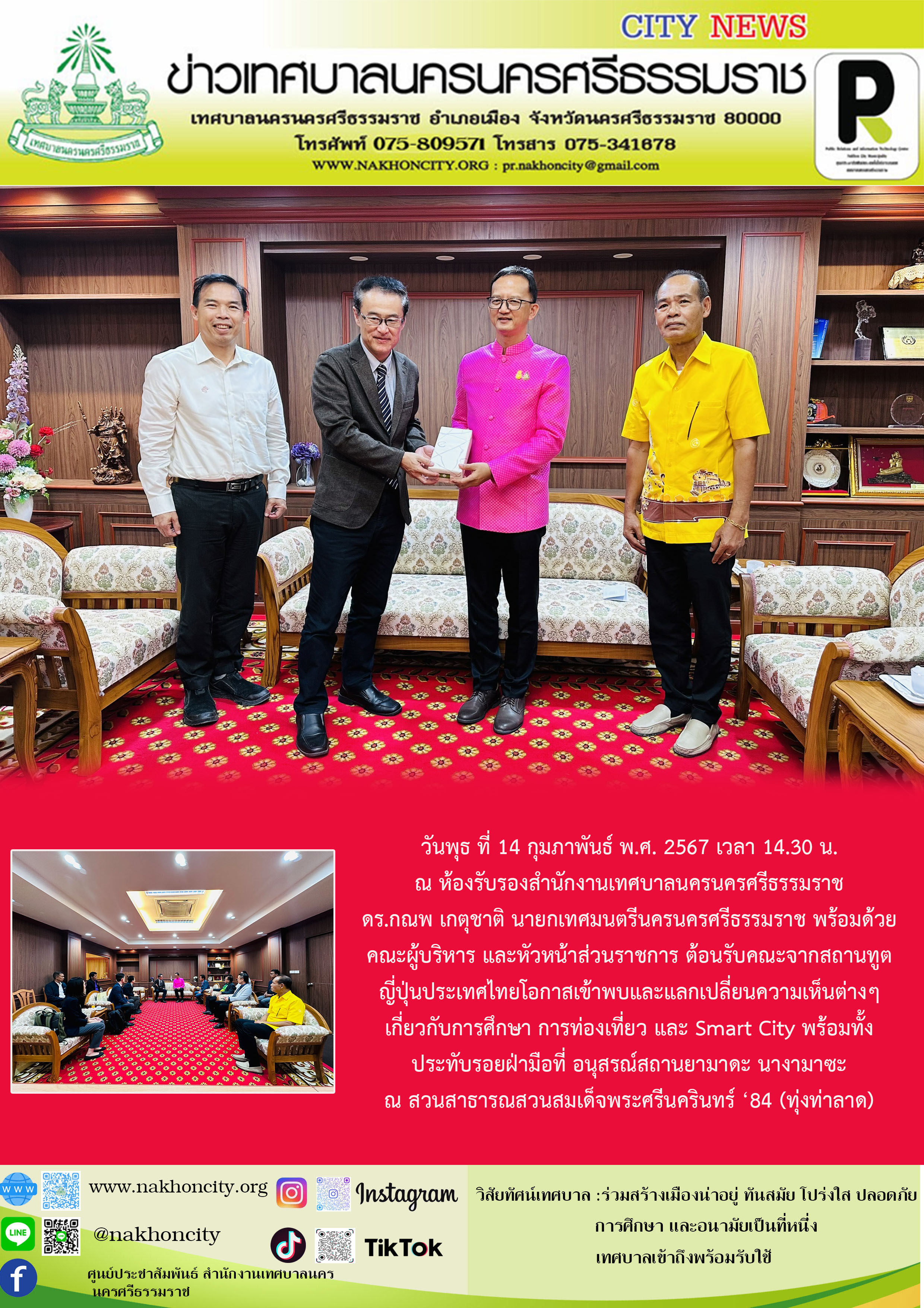 | ดร.กณพ เกตุชาติ นายกเทศมนตรีนครนครศรีธรรมราช พร้อมด้วยคณะผู้บริหาร และหัวหน้าส่วนราชการ ต้อนรับคณะจากสถานทูตญี่ปุ่นประเทศไทย |