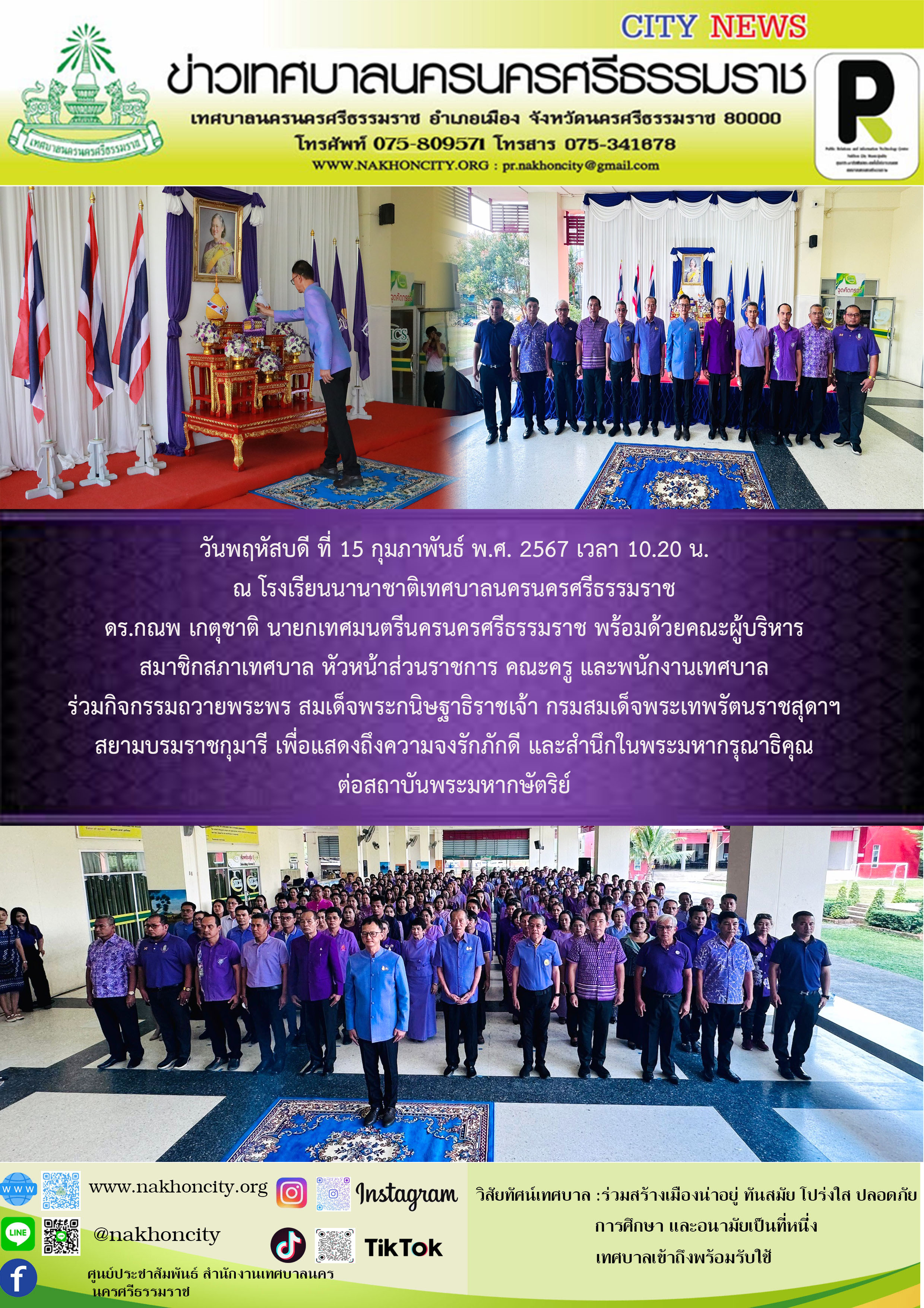 | ดร.กณพ เกตุชาติ นายกเทศมนตรีนครนครศรีธรรมราช พร้อมด้วยคณะผู้บริหาร สมาชิกสภาเทศบาล หัวหน้าส่วนราชการ คณะครู และพนักงานเทศบาล ร่วมกิจกรรมถวายพระพร สมเด็จพระกนิษฐาธิราชเจ้า กรมสมเด็จพระเทพรัตนราชสุดาฯ สยามบรมราชกุมารี เพื่อแสดงถึงความจงรักภักดี และสำนึกในพระมหากรุณาธิคุณ ต่อสถาบันพระมหากษัตริย์ |
