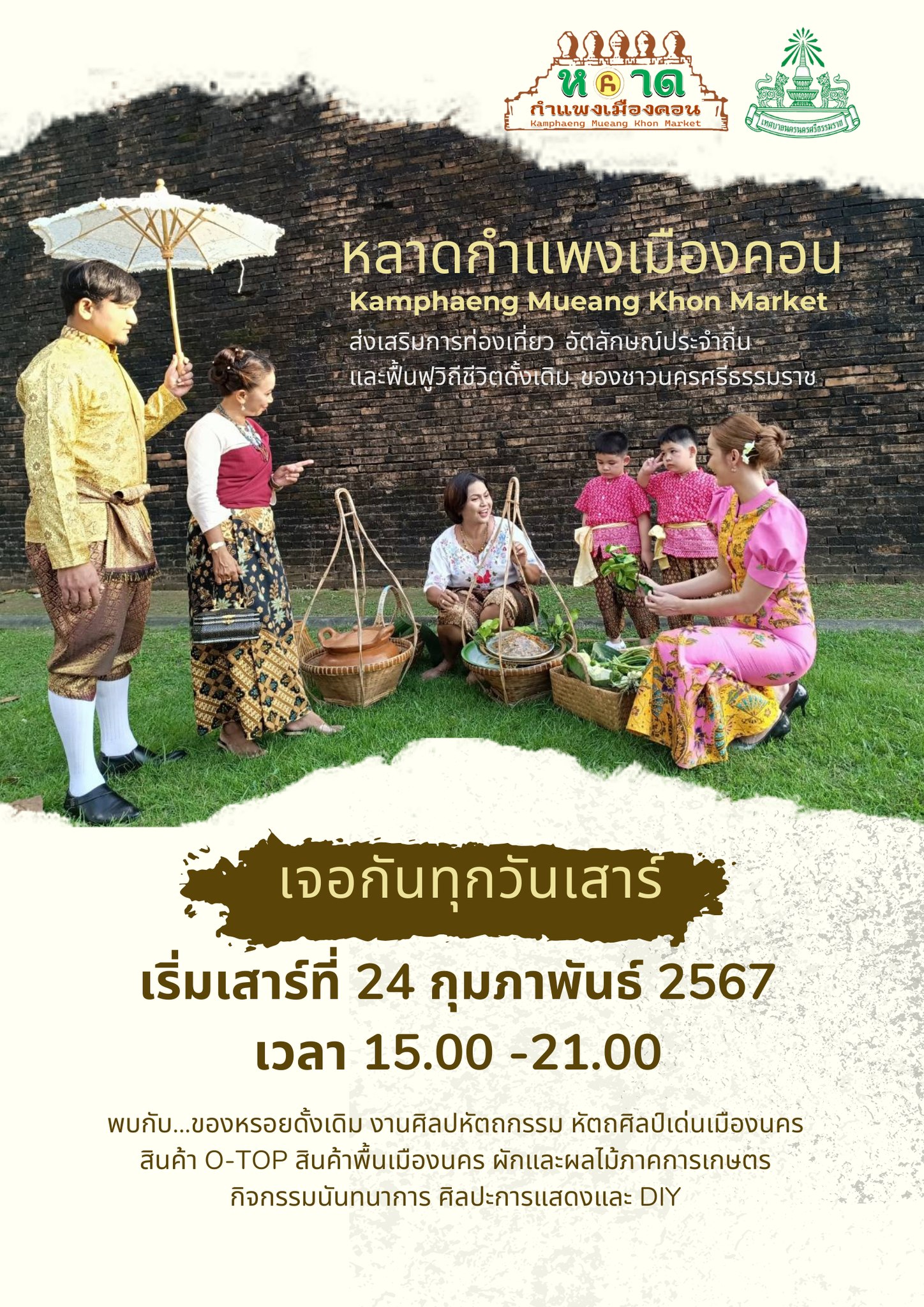 | เทศบาลนครนครศรีธรรมราช กำหนด เปิด “หลาดกำแพงเมืองคอน” ตลาดนัดท้องถิ่นสีเขียว ส่งเสริมเศรษฐกิจฐานราก การผลิต การตลาด และการจำหน่าย สินค้าท้องถิ่น เริ่ม นัดแรก วันเสาร์ที่ 24 กุมภาพันธ์ 2567 |