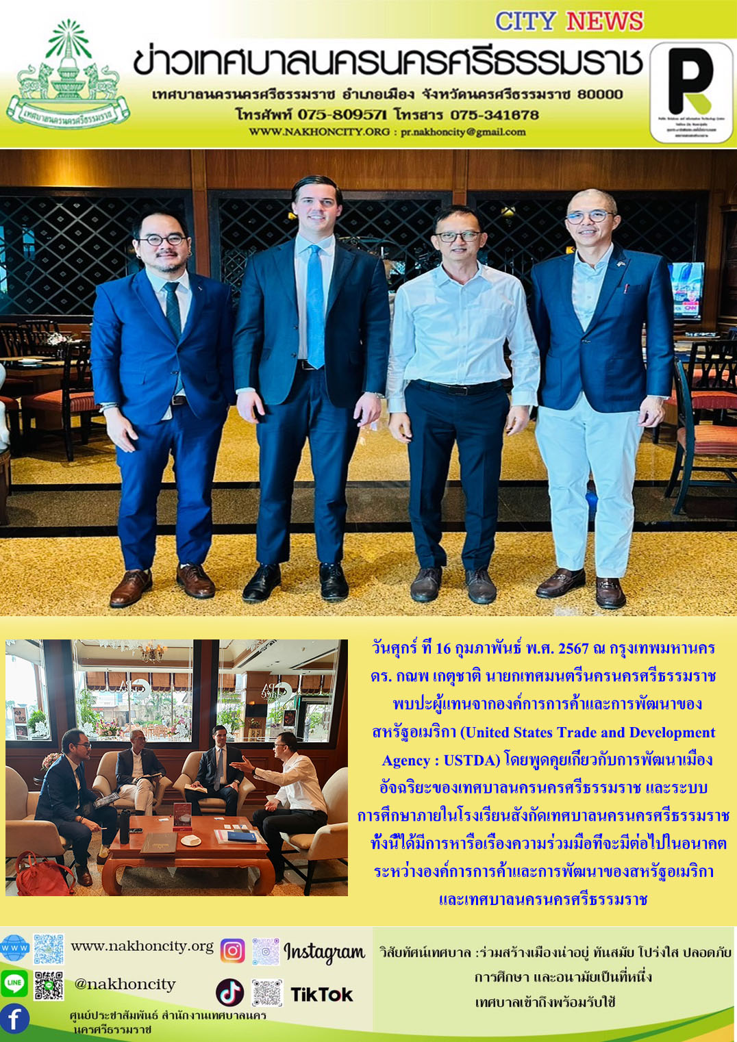 | ดร. กณพ เกตุชาติ นายกเทศมนตรีนครนครศรีธรรมราช พบปะผู้แทนจากองค์การการค้าและการพัฒนาของสหรัฐอเมริกา (United States Trade and Development Agency : USTDA) โดยพูดคุยเกี่ยวกับการพัฒนาเมืองอัจฉริยะของเทศบาลนครนครศรีธรรมราช และระบบการศึกษาภายในโรงเรียนสังกัดเทศบาลนครนครศรีธรรมราช ทั้งนี้ได้มีการหารือเรื่องความร่วมมือที่จะมีต่อไปในอนาคตระหว่างองค์การการค้าและการพัฒนาของสหรัฐอเมริกาและเทศบาลนครนครศรีธรรมราช |