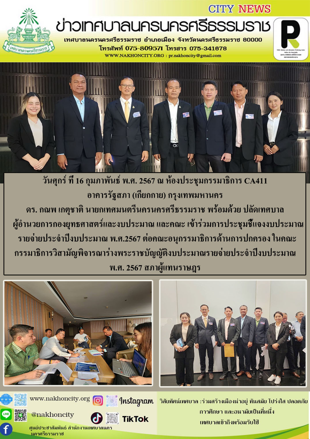 | ดร.กณพ เกตุชาติ นายกเทศมนตรีนครนครศรีธรรมราช เข้าร่วมการประชุมชี้แจงงบประมาณรายจ่ายประจำปีงบประมาณ พ.ศ.2567 ต่อคณะอนุกรรมาธิการด้านการปกครอง ในคณะกรรมาธิการวิสามัญพิจารณาร่างพระราชบัญญัติงบประมาณรายจ่ายประจำปีงบประมาณ พ.ศ. 2567 สภาผู้แทนราษฎร |