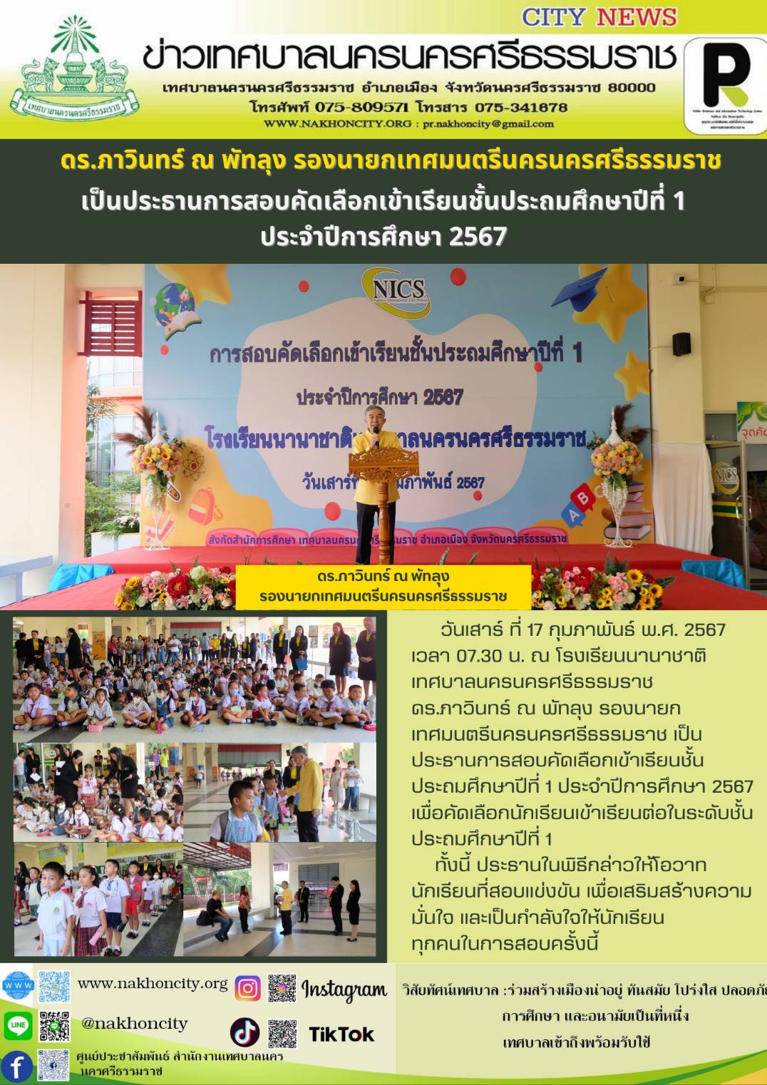 | ดร.ภาวินทร์ ณ พัทลุง รองนายกเทศมนตรีนครนครศรีธรรมราช เป็นประธานการสอบคัดเลือกเข้าเรียนชั้นประถมศึกษาปีที่ 1 ประจำปีการศึกษา 2567 |