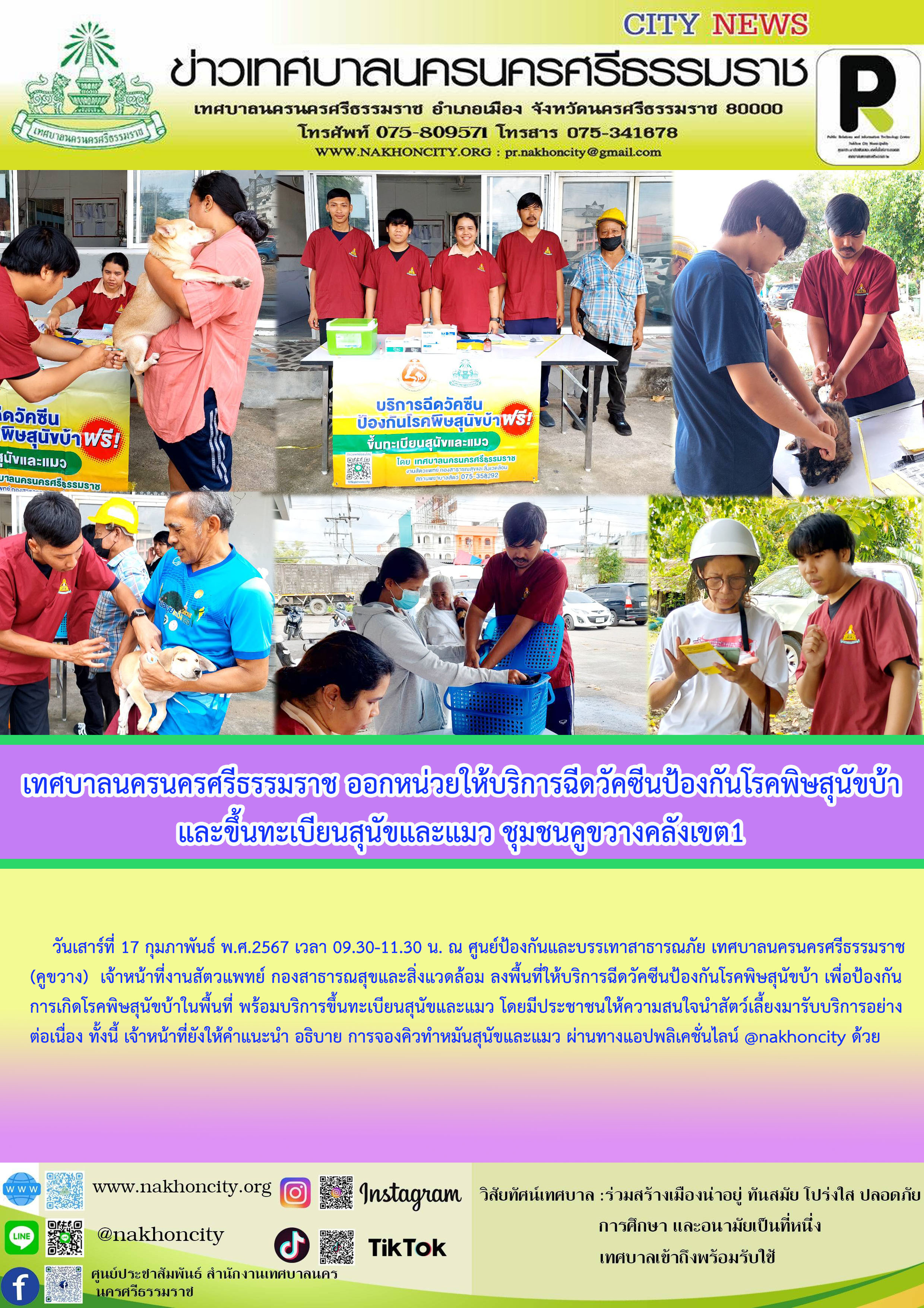 | เทศบาลนครนครศรีธรรมราช ออกหน่วยให้บริการฉีดวัคซีนป้องกันโรคพิษสุนัขบ้า พร้อมบริการขึ้นทะเบียนสุนัขและแมว ชุมชนคูขวางคลังเขต1 |