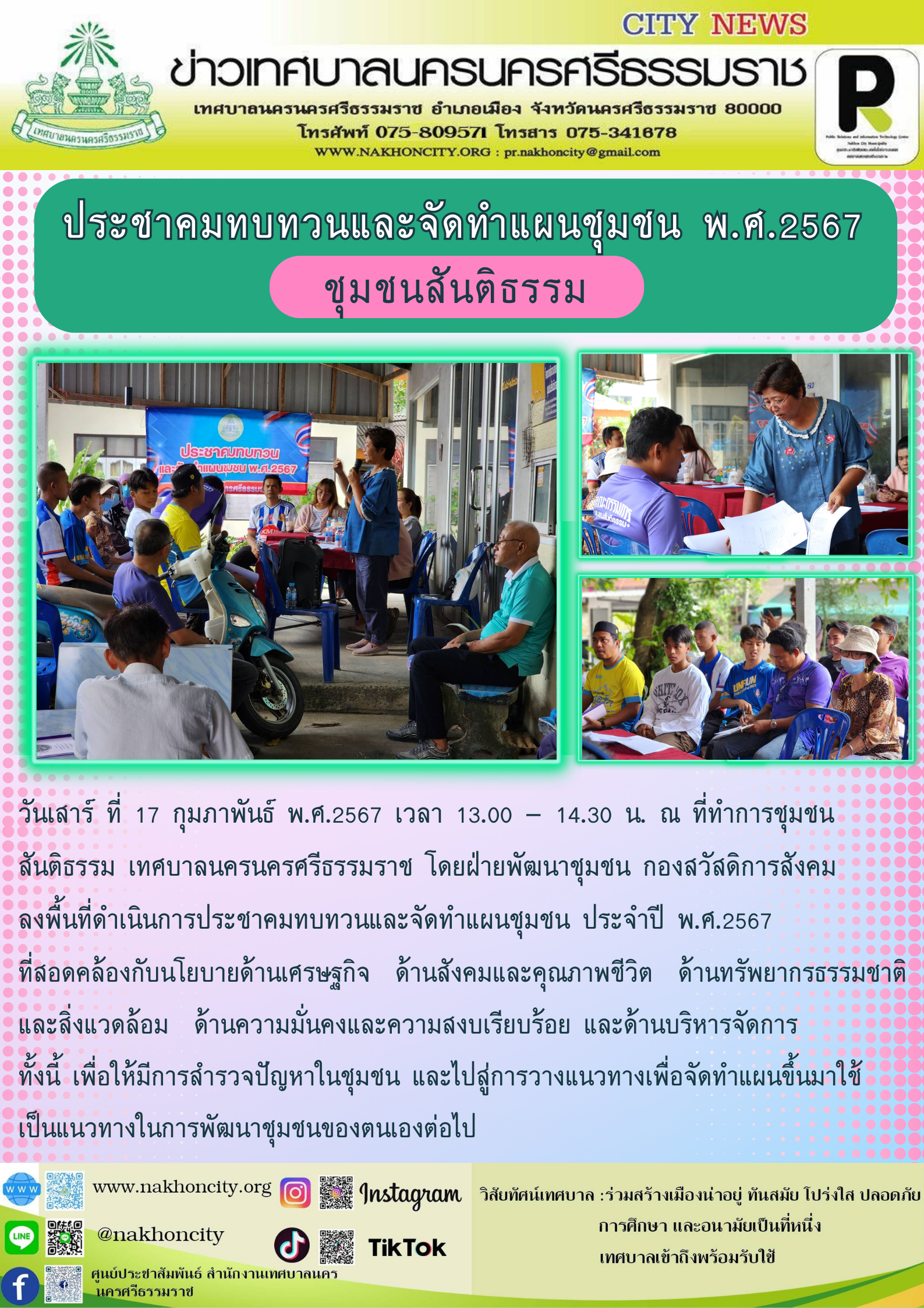 | เทศบาลนครนครศรีธรรมราช โดยฝ่ายพัฒนาชุมชน กองสวัสดิการสังคม ลงพื้นที่ดำเนินการประชาคมทบทวนและจัดทำแผนชุมชน ประจำปี พ.ศ.2567 (ชุมชนสันติธรรม) |