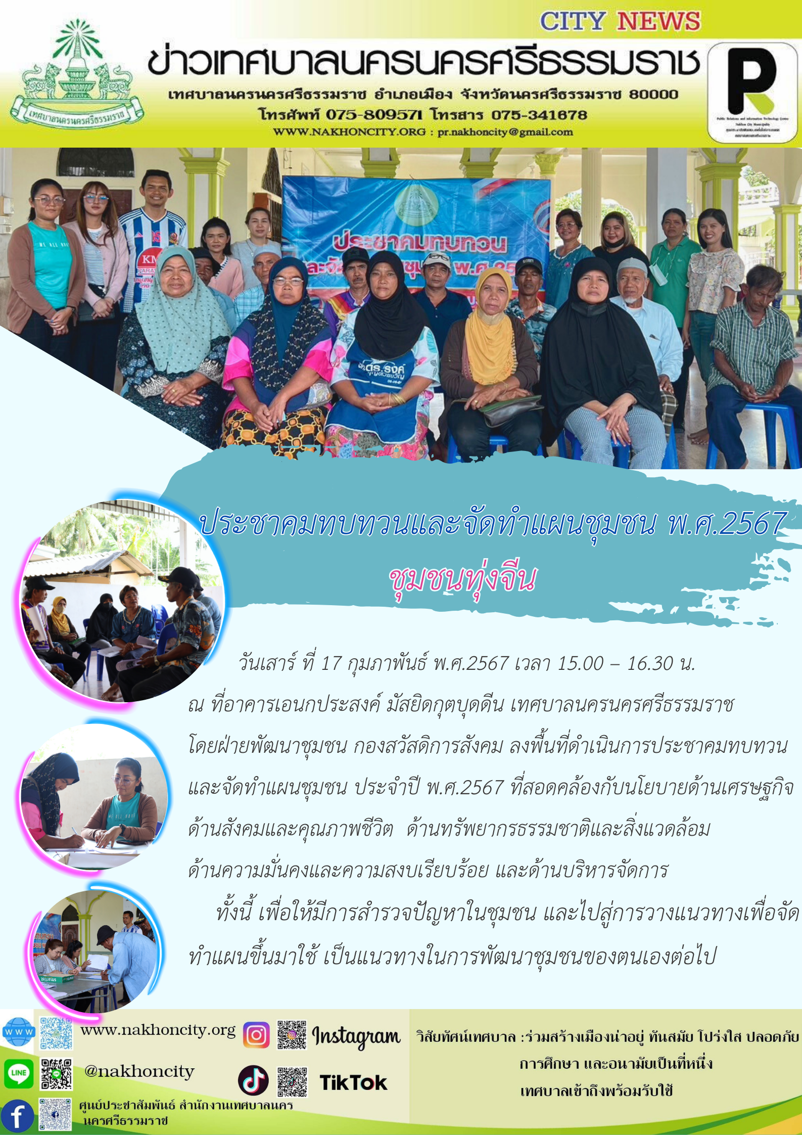 | เทศบาลนครนครศรีธรรมราช โดยฝ่ายพัฒนาชุมชน กองสวัสดิการสังคม ลงพื้นที่ดำเนินการประชาคมทบทวนและจัดทำแผนชุมชน ประจำปี พ.ศ.2567 (ชุมชนทุ่งจีน) |