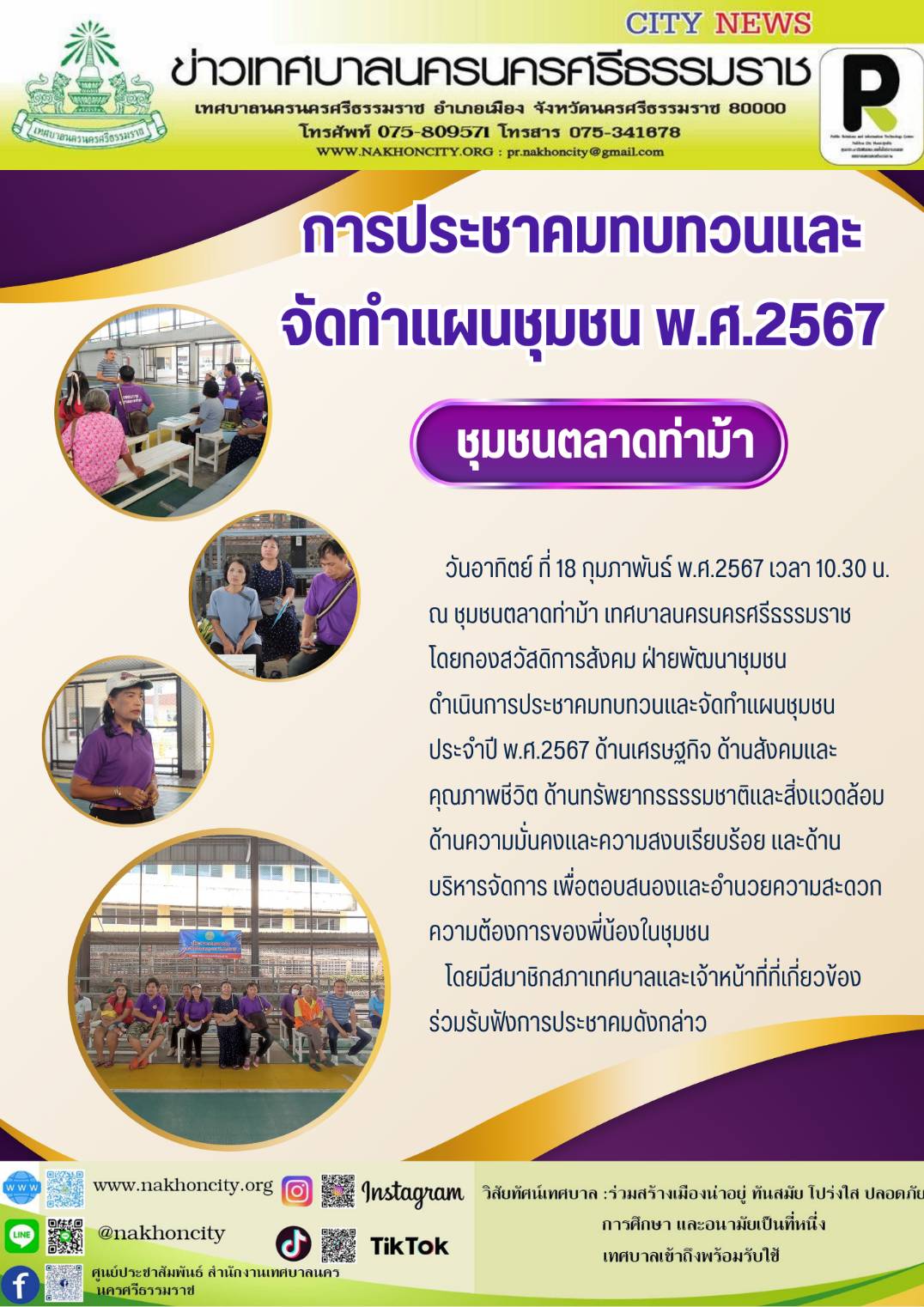 | เทศบาลนครนครศรีธรรมราช โดยกองสวัสดิการสังคม ฝ่ายพัฒนาชุมชน ดำเนินการประชาคมทบทวนและจัดทำแผนชุมชน ประจำปี พ.ศ.2567 (ชุมชนตลาดท่าม้า) |