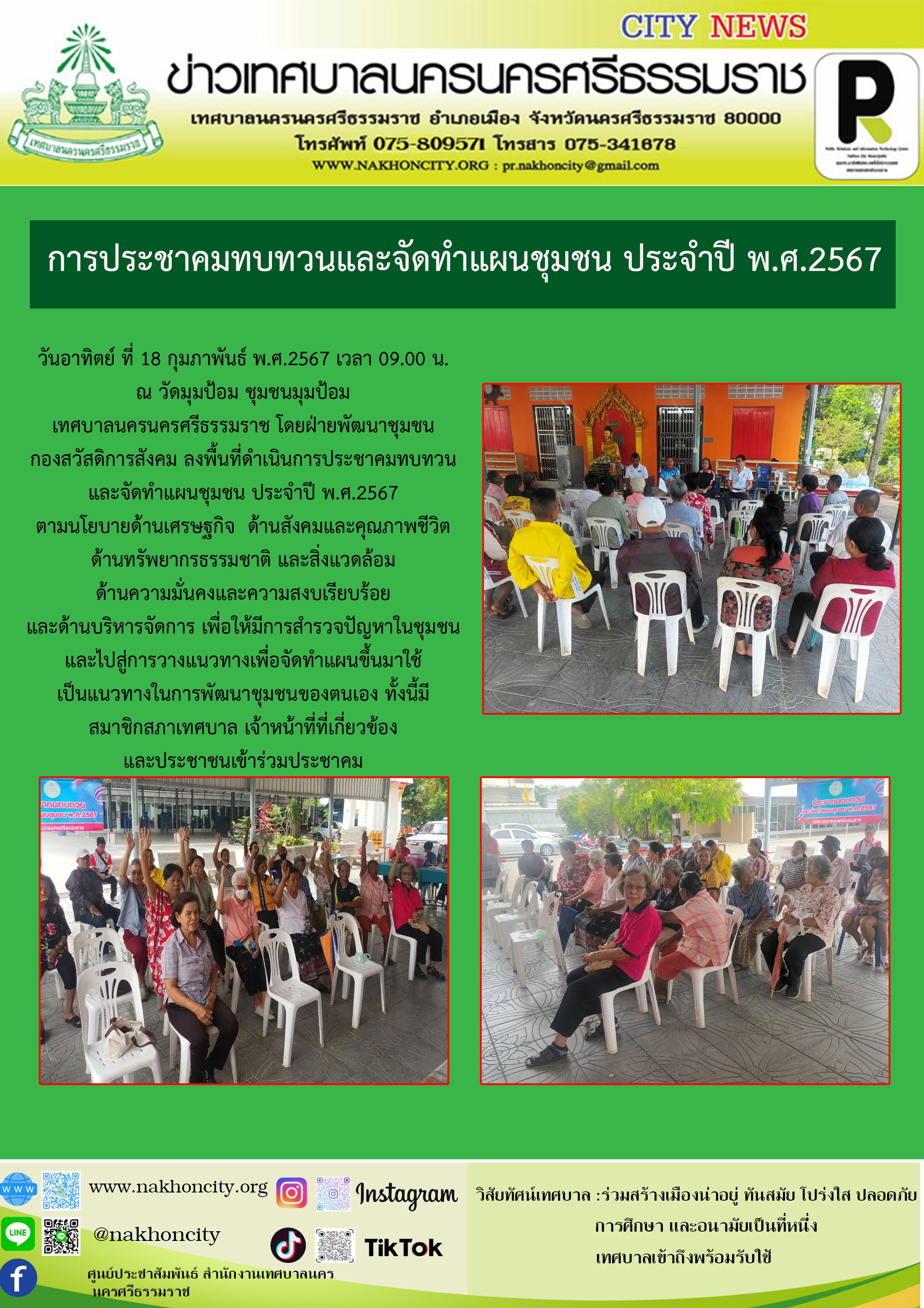 | วันอาทิตย์ ที่ 18 กุมภาพันธ์ พ.ศ.2567 เวลา 09.00 น. ณ วัดมุมป้อม ชุมชน มุมป้อม เทศบาลนครนครศรีธรรมราช โดยฝ่ายพัฒนาชุมชน กองสวัสดิการสังคม ลงพื้นที่ดำเนินการประชาคมทบทวนและจัดทำแผนชุมชน ประจำปี พ.ศ.2567 ตามนโยบายด้านเศรษฐกิจ ด้านสังคมและคุณภาพชีวิต ด้านทรัพยากรธรรมชาติ และสิ่งแวดล้อม ด้านความมั่นคงและความสงบเรียบร้อย และด้านบริหารจัดการ เพื่อให้มีการสำรวจปัญหาในชุมชน และไปสู่การวางแนวทางเพื่อจัดทำแผนขึ้นมาใช้ เป็นแนวทางในการพัฒนาชุมชนของตนเอง ทั้งนี้มี สมาชิกสภาเทศบาล เจ้าหน้าที่ที่เกี่ยวข้อง และประชาชนเข้าร่วมประชาคม