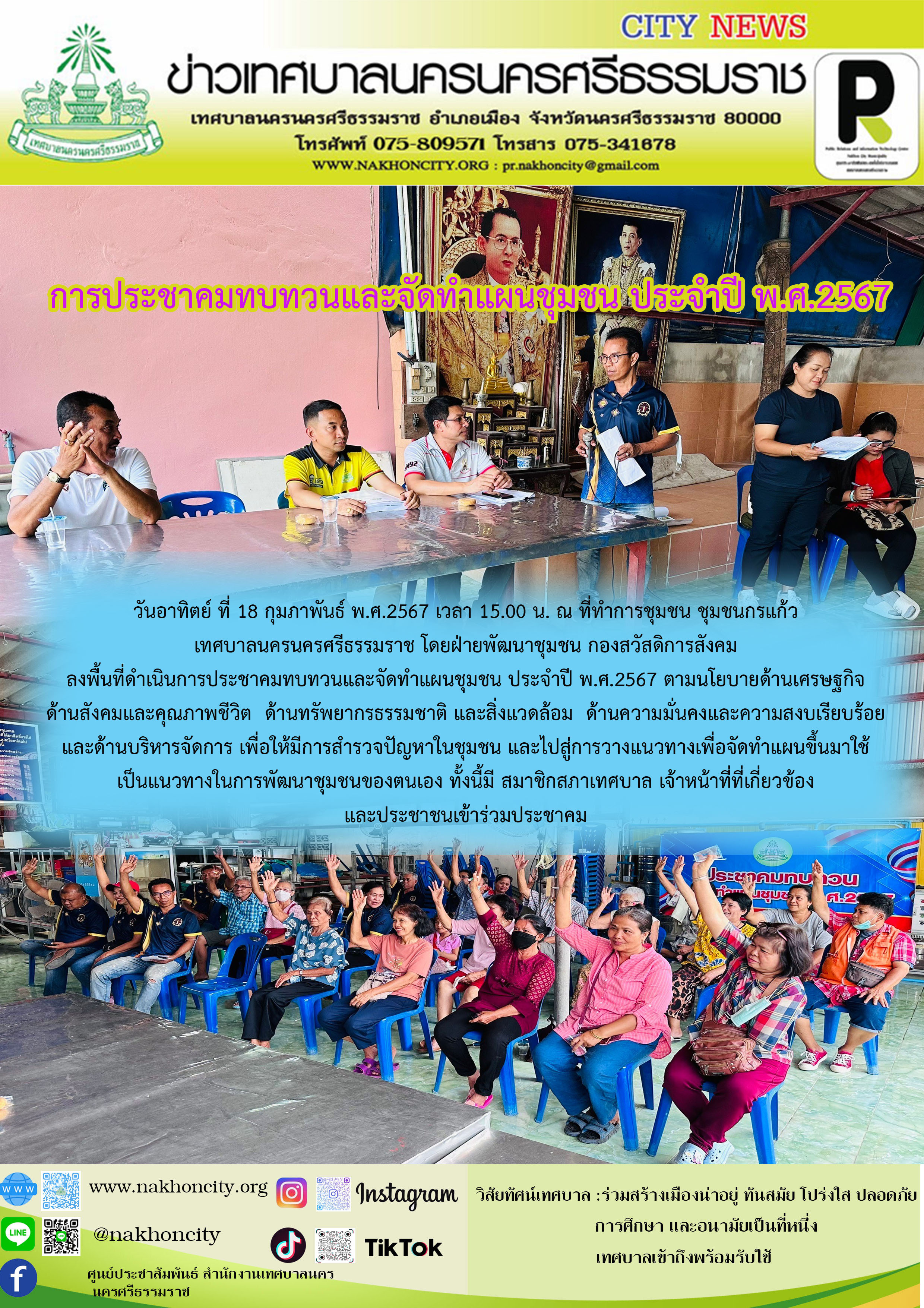 | วันอาทิตย์ ที่ 18 กุมภาพันธ์ พ.ศ.2567 เวลา 15.00 น. ณ ที่ทำการชุมชน ชุมชนกรแก้ว เทศบาลนครนครศรีธรรมราช โดยฝ่ายพัฒนาชุมชน กองสวัสดิการสังคม ลงพื้นที่ดำเนินการประชาคมทบทวนและจัดทำแผนชุมชน ประจำปี พ.ศ.2567 ตามนโยบายด้านเศรษฐกิจ ด้านสังคมและคุณภาพชีวิต ด้านทรัพยากรธรรมชาติ และสิ่งแวดล้อม ด้านความมั่นคงและความสงบเรียบร้อย และด้านบริหารจัดการ เพื่อให้มีการสำรวจปัญหาในชุมชน และไปสู่การวางแนวทางเพื่อจัดทำแผนขึ้นมาใช้ เป็นแนวทางในการพัฒนาชุมชนของตนเอง ทั้งนี้มี สมาชิกสภาเทศบาล เจ้าหน้าที่ที่เกี่ยวข้อง และประชาชนเข้าร่วมประชาคม ภาพ//ข่าว//ไกรสิทธิ ตรวจทาน//ฐิตินันท์ |