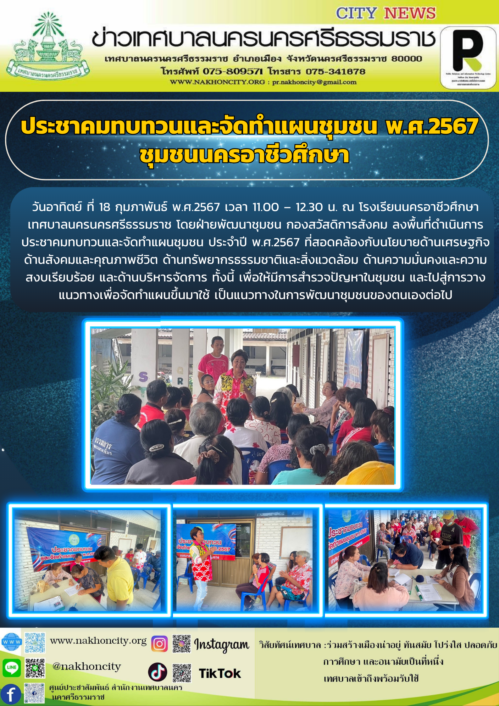| เทศบาลนครนครศรีธรรมราช โดยฝ่ายพัฒนาชุมชน กองสวัสดิการสังคม ลงพื้นที่ดำเนินการประชาคมทบทวนและจัดทำแผนชุมชน ประจำปี พ.ศ.2567 (ชุมชนนครอาชีวศึกษา) |
