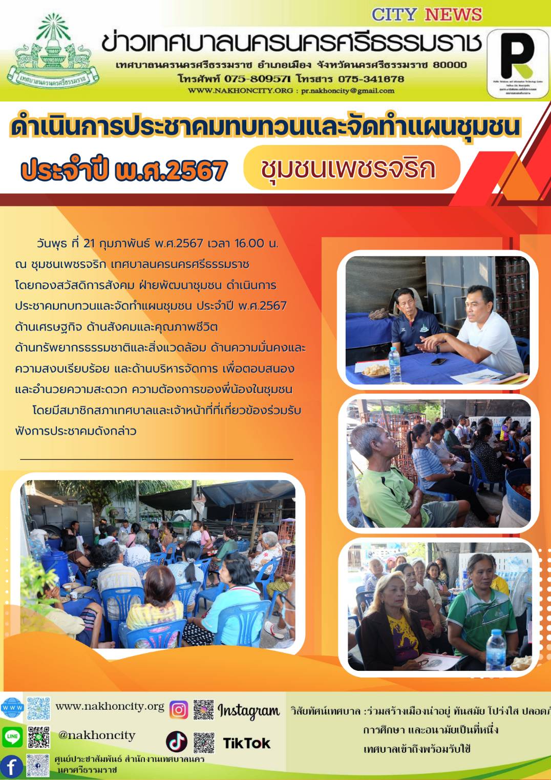| เทศบาลนครนครศรีธรรมราช โดยกองสวัสดิการสังคม ฝ่ายพัฒนาชุมชน ดำเนินการประชาคมทบทวนและจัดทำแผนชุมชน ประจำปี พ.ศ.2567 (ชุมชนเพชรจริก) |