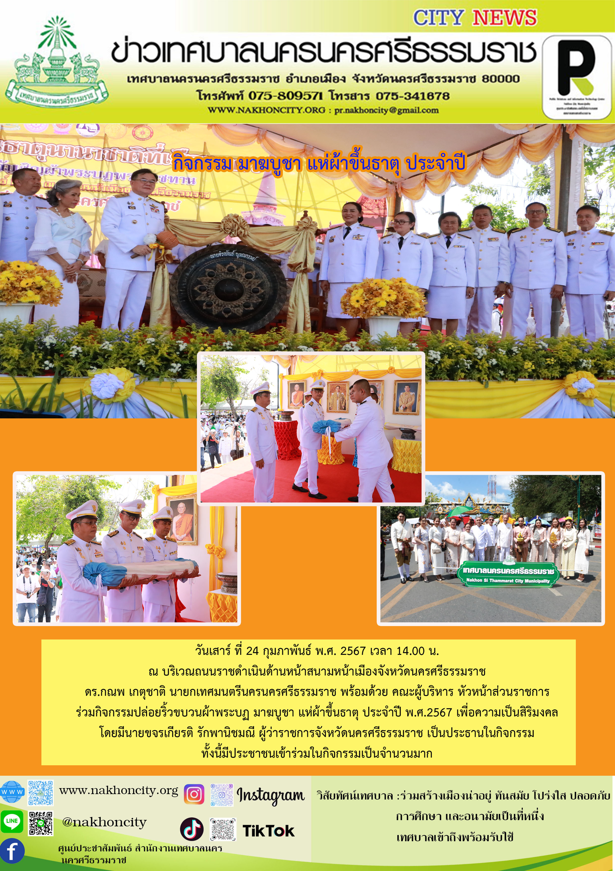 | ดร.กณพ เกตุชาติ นายกเทศมนตรีนครนครศรีธรรมราช พร้อมด้วย คณะผู้บริหาร หัวหน้าส่วนราชการ ร่วมกิจกรรมปล่อยริ้วขบวนผ้าพระบฏ มาฆบูชา แห่ผ้าขึ้นธาตุ ประจำปี พ.ศ.2567 |