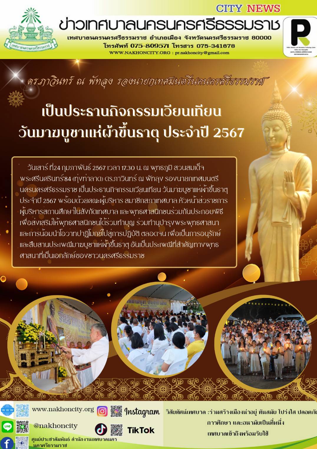 | วันเสาร์ ที่24 กุมภาพันธ์ 2567 เวลา 17.30 น. ณ พุทธภูมิ สวนสมเด็จพระศรีนครินทร์’84 (ทุ่งท่าลาด) ดร.ภาวินทร์ ณ พัทลุง รองนายกเทศมนตรีนครนครศรีธรรมราช เป็นประธานกิจกรรมเวียนเทียน วันมาฆบูชาแห่ผ้าขึ้นธาตุ ประจำปี 2567 พร้อมด้วยคณะผู้บริหาร สมาชิกสภาเทศบาล หัวหน้าส่วนราชการ ผู้บริหารสถานศึกษาในสังกัดเทศบาล และพุทธศาสนิกชนร่วมกันประกอบพิธี เพื่อส่งเสริมให้พุทธศาสนิกชนได้ร่วมทำบุญ ร่วมทำนุบำรุงพระพุทธศาสนา และการน้อมนำโอวาทปาฏิโมกข์ไปสู่การปฏิบัติ ตลอดจน เพื่อเป็นการอนุรักษ์และสืบสานประเพณีมาฆบูชาแห่ผ้าขึ้นธาตุ อันเป็นประเพณีที่สำคัญทางพุทธศาสนาที่เป็นเอกลักษ์ของชาวนครศรีธรรมราช …………… ภาพ//ข่าว//จันทร์จิรา |