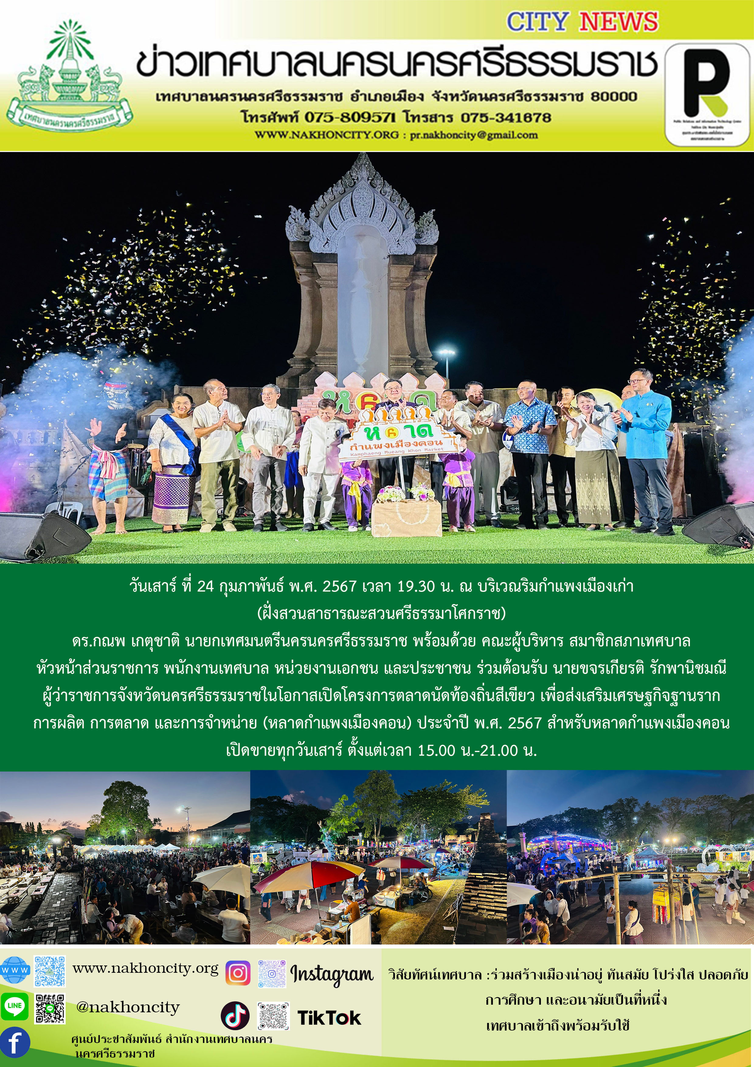 | ดร.กณพ เกตุชาติ นายกเทศมนตรีนครนครศรีธรรมราช พร้อมด้วย คณะผู้บริหาร สมาชิกสภาเทศบาล หัวหน้าส่วนราชการ พนักงานเทศบาล หน่วยงานเอกชน และประชาชน ร่วมต้อนรับ นายขจรเกียรติ รักพานิชมณี ผู้ว่าราชการจังหวัดนครศรีธรรมราชในโอกาสเปิดโครงการตลาดนัดท้องถิ่นสีเขียว (หลาดกำแพงเมืองคอน) |