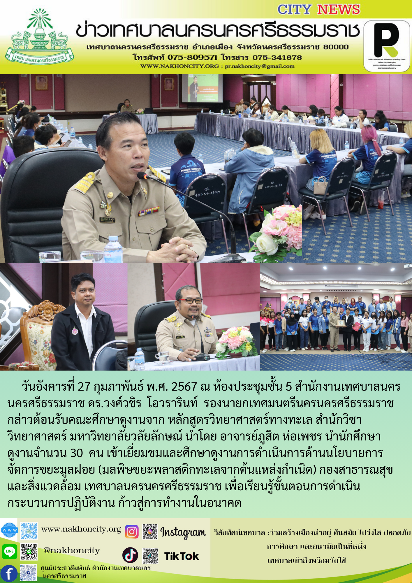 | วันอังคารที่ 27 กุมภาพันธ์ พ.ศ. 2567 ณ ห้องประชุมชั้น 5 สำนักงานเทศบาลนครนครศรีธรรมราช ดร.วงศ์วชิร โอวรารินท์ รองนายกเทศมนตรีนครนครศรีธรรมราช กล่าวต้อนรับคณะศึกษาดูงานจาก หลักสูตรวิทยาศาสตร์ทางทะเล สำนักวิชาวิทยาศาสตร์ มหาวิทยาลัยวลัยลักษณ์ นำโดย อาจารย์ภูสิต ห่อเพชร นำนักศึกษาดูงานจำนวน 30 คน เข้าเยี่ยมชมและศึกษาดูงานการดำเนินการด้านนโยบายการจัดการขยะมูลฝอย (มลพิษขยะพลาสติกทะเลจากต้นแหล่งกำเนิด) กองสาธารณสุขและสิ่งแวดล้อม เทศบาลนครนครศรีธรรมราช เพื่อเรียนรู้ขั้นตอนการดำเนิน กระบวนการปฏิบัติงาน ก้าวสู่การทำงานในอนาคต
