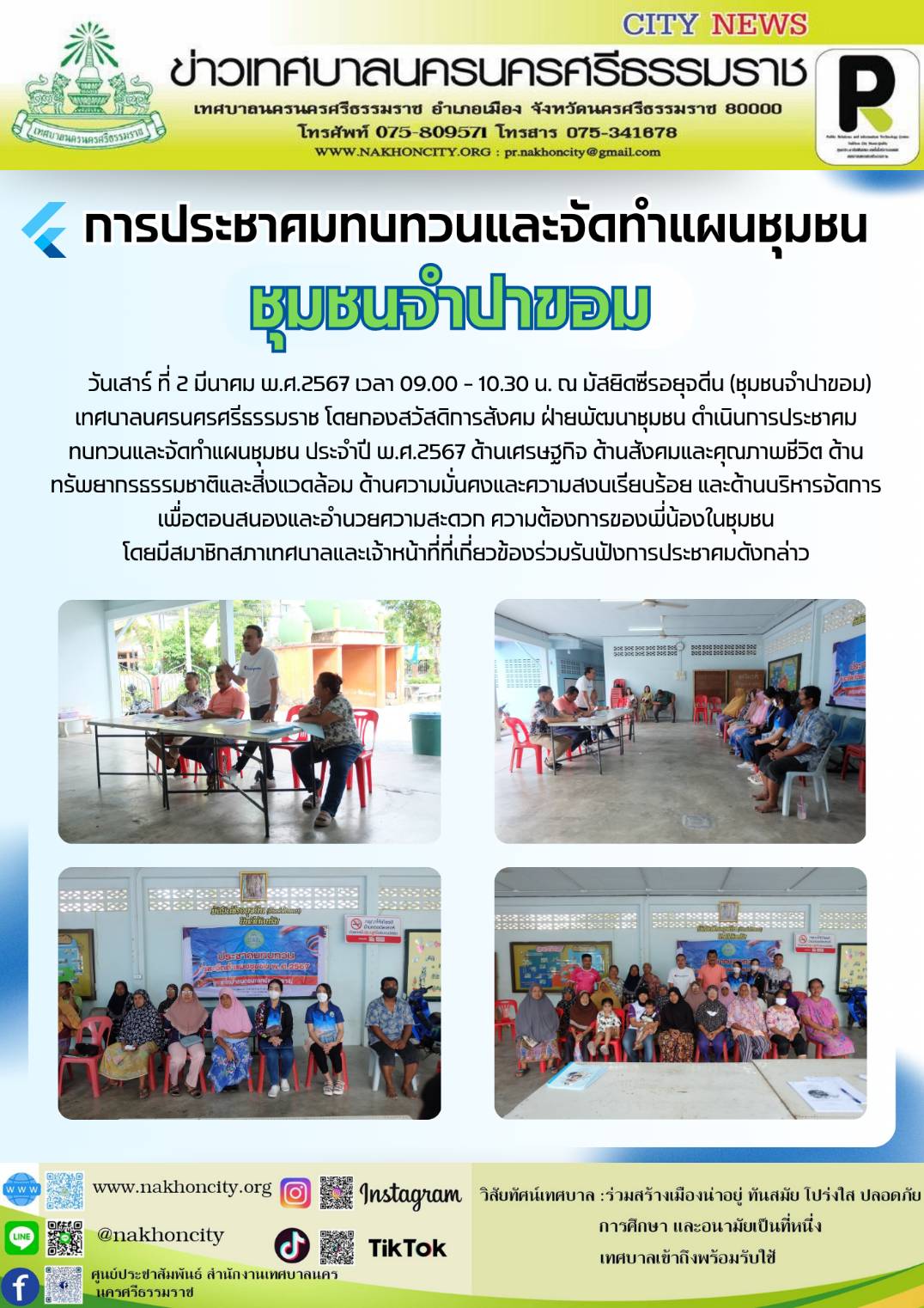 | เทศบาลนครนครศรีธรรมราช โดยกองสวัสดิการสังคม ฝ่ายพัฒนาชุมชน ดำเนินการประชาคมทบทวนและจัดทำแผนชุมชน ประจำปี พ.ศ.2567 (ชุมชนจำปาขอม) |