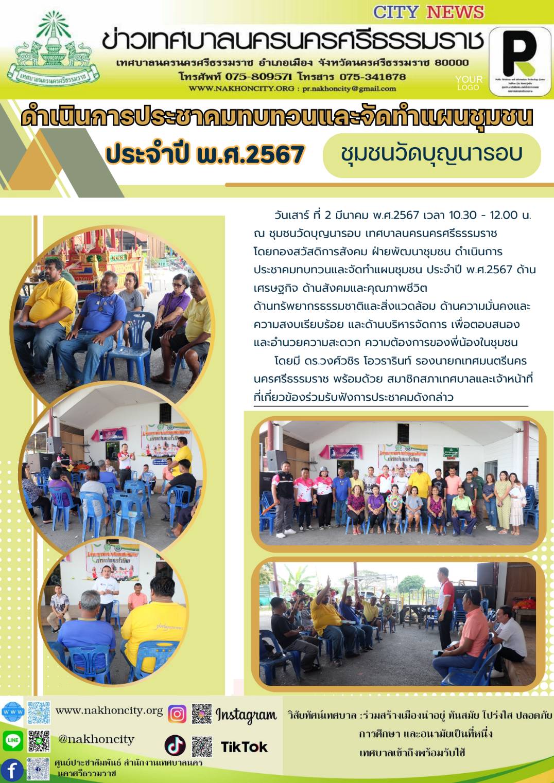 | เทศบาลนครนครศรีธรรมราช โดยกองสวัสดิการสังคม ฝ่ายพัฒนาชุมชน ดำเนินการประชาคมทบทวนและจัดทำแผนชุมชน ประจำปี พ.ศ.2567 (ชุมชนวัดบุญนารอบ) |