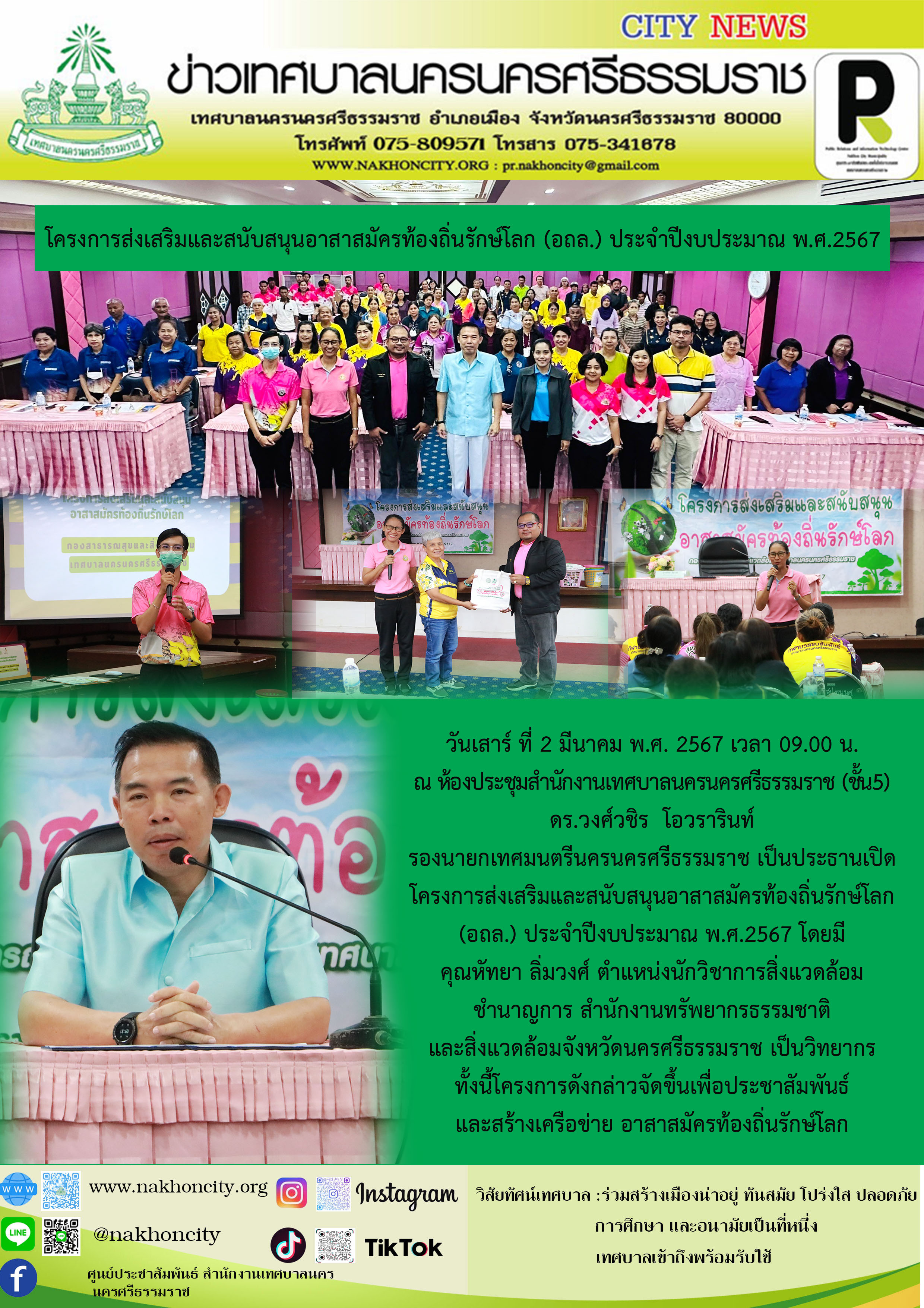 | ดร.วงศ์วชิร โอวรารินท์ รองนายกเทศมนตรีนครนครศรีธรรมราช เป็นประธานเปิด โครงการส่งเสริมและสนับสนุนอาสาสมัครท้องถิ่นรักษ์โลก (อถล.) ประจำปีงบประมาณ พ.ศ.2567 |