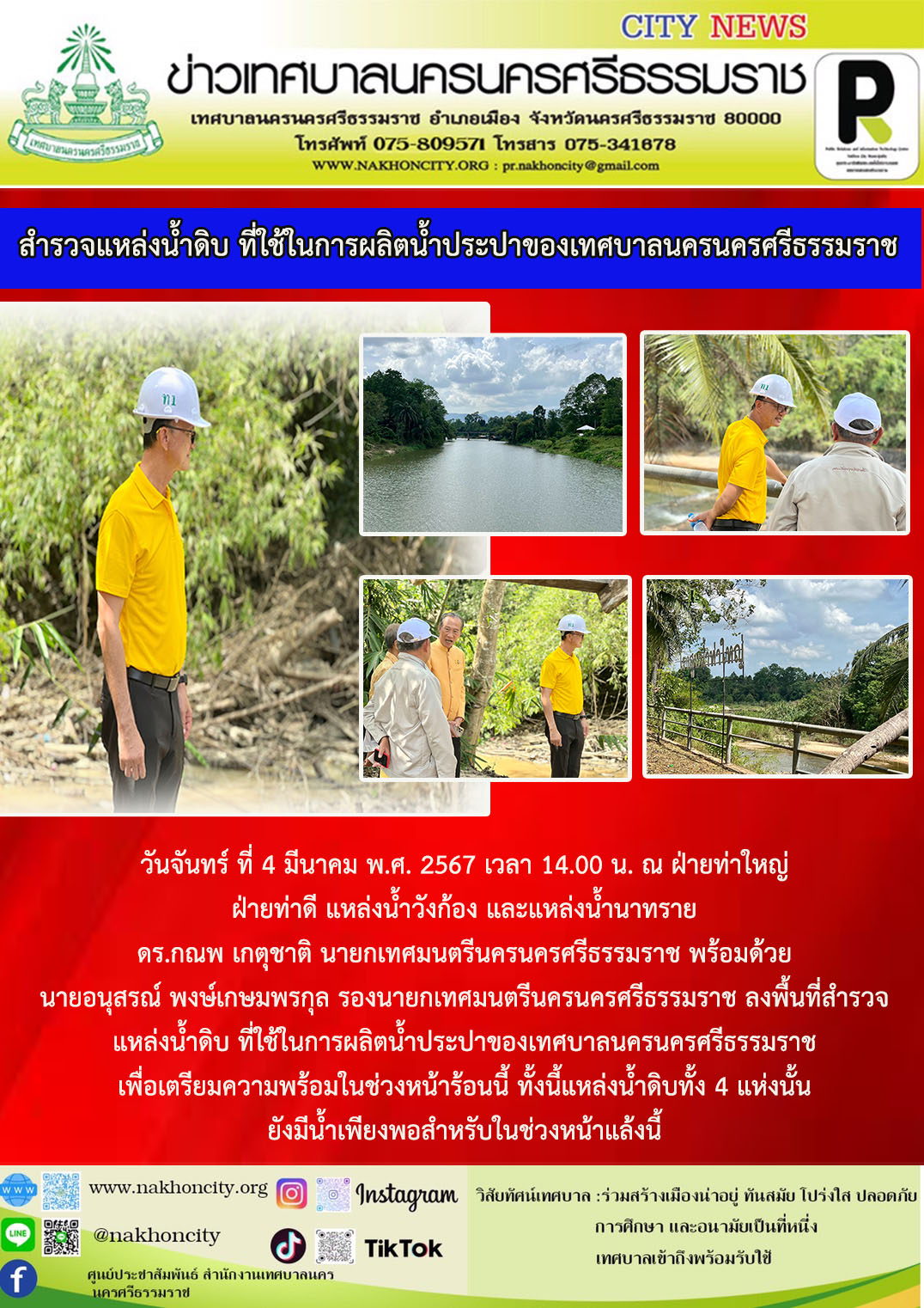 | ดร.กณพ เกตุชาติ นายกเทศมนตรีนครนครศรีธรรมราช พร้อมด้วยนายอนุสรณ์ พงษ์เกษมพรกุล รองนายกเทศมนตรีนครนครศรีธรรมราช ลงพื้นที่สำรวจแหล่งน้ำดิบ ที่ใช้ในการผลิตน้ำประปาของเทศบาลนครนครศรีธรรมราช เพื่อเตรียมความพร้อมในช่วงหน้าร้อนนี้ |