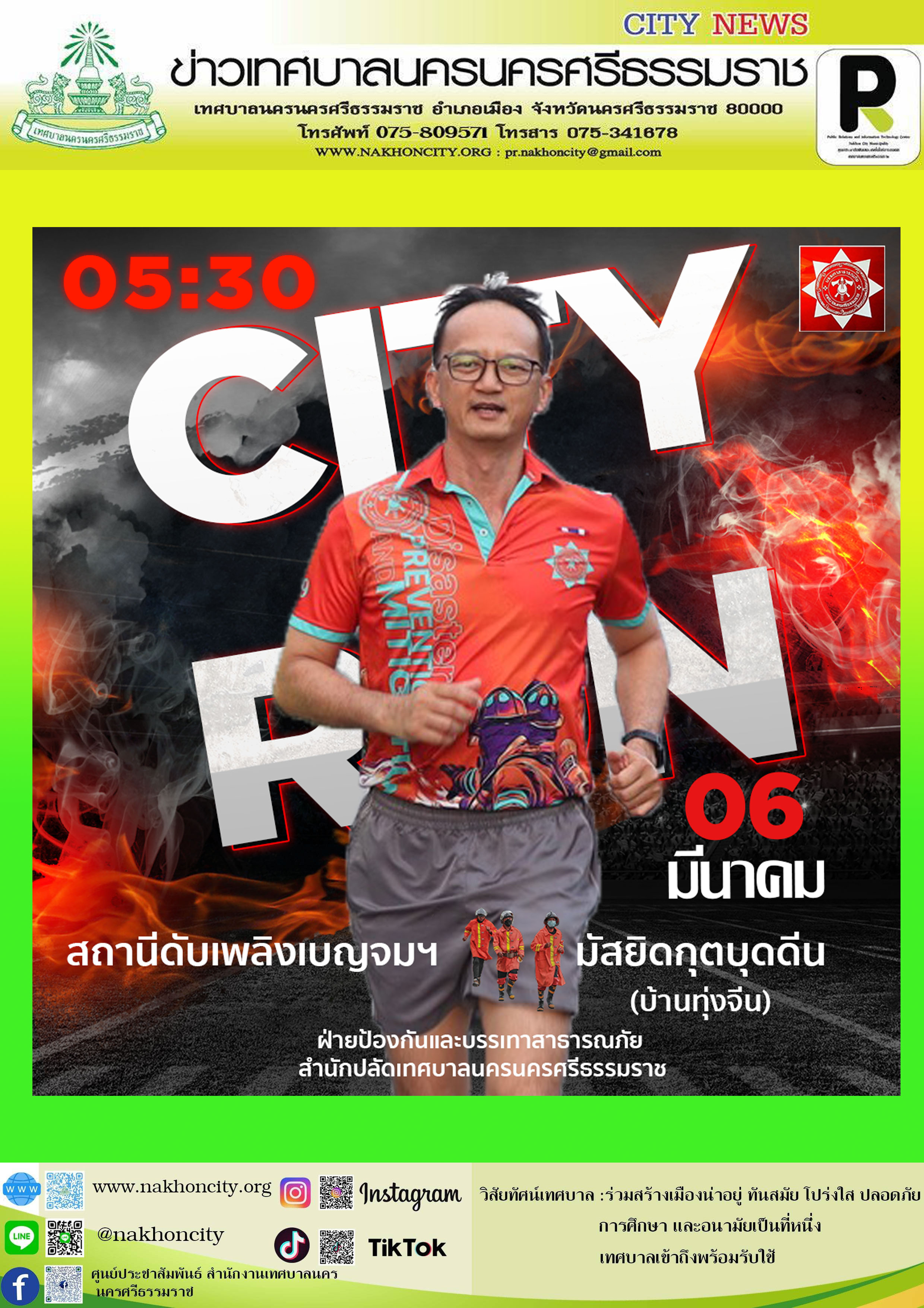 | ขอเชิญประชาชนร่วมกิจกรรม วิ่ง “City Run” วันพุธ วันพุธที่ 6 มีนาคม พ.ศ.2567 เวลา 05.30 น. ณ จุดนัดพบ สถานีดับเพลิงเบญจมฯ |