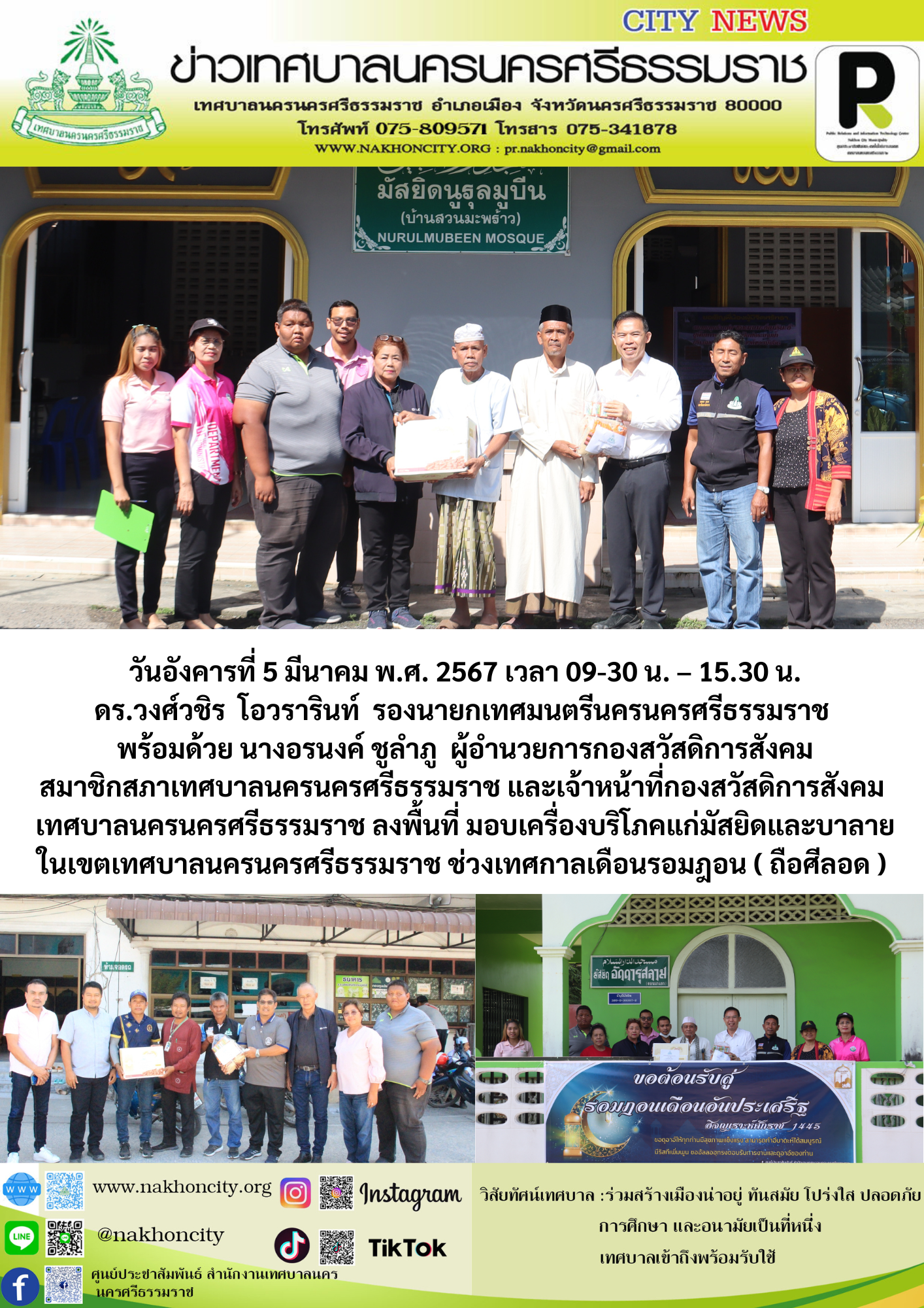 | วันอังคารที่ 5 มีนาคม พ.ศ. 2567 เวลา 09-30 น. – 15.30 น. ดร.วงศ์วชิร โอวรารินท์ รองนายกเทศมนตรีนครนครศรีธรรมราช พร้อมด้วย นางอรนงค์ ชูลำภู ผู้อำนวยการกองสวัสดิการสังคม สมาชิกสภาเทศบาลนครนครศรีธรรมราช และเจ้าหน้าที่กองสวัสดิการสังคม เทศบาลนครนครศรีธรรมราช ลงพื้นที่ มอบเครื่องบริโภคแก่มัสยิดและบาลาย ในเขตเทศบาลนครนครศรีธรรมราช ช่วงเทศกาลเดือนรอมฎอน ( ถือศีลอด ) |