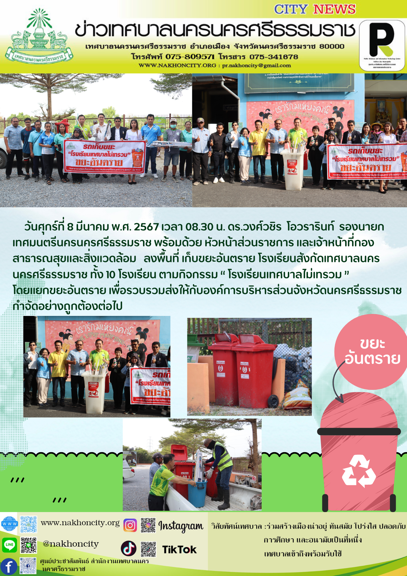 | ดร.วงศ์วชิร โอวรารินท์ รองนายกเทศมนตรีนครนครศรีธรรมราช พร้อมด้วย หัวหน้าส่วนราชการ และเจ้าหน้าที่กองสาธารณสุขและสิ่งแวดล้อม ลงพื้นที่ เก็บขยะอันตราย โรงเรียนสังกัดเทศบาลนครนครศรีธรรมราช ทั้ง 10 โรงเรียน |