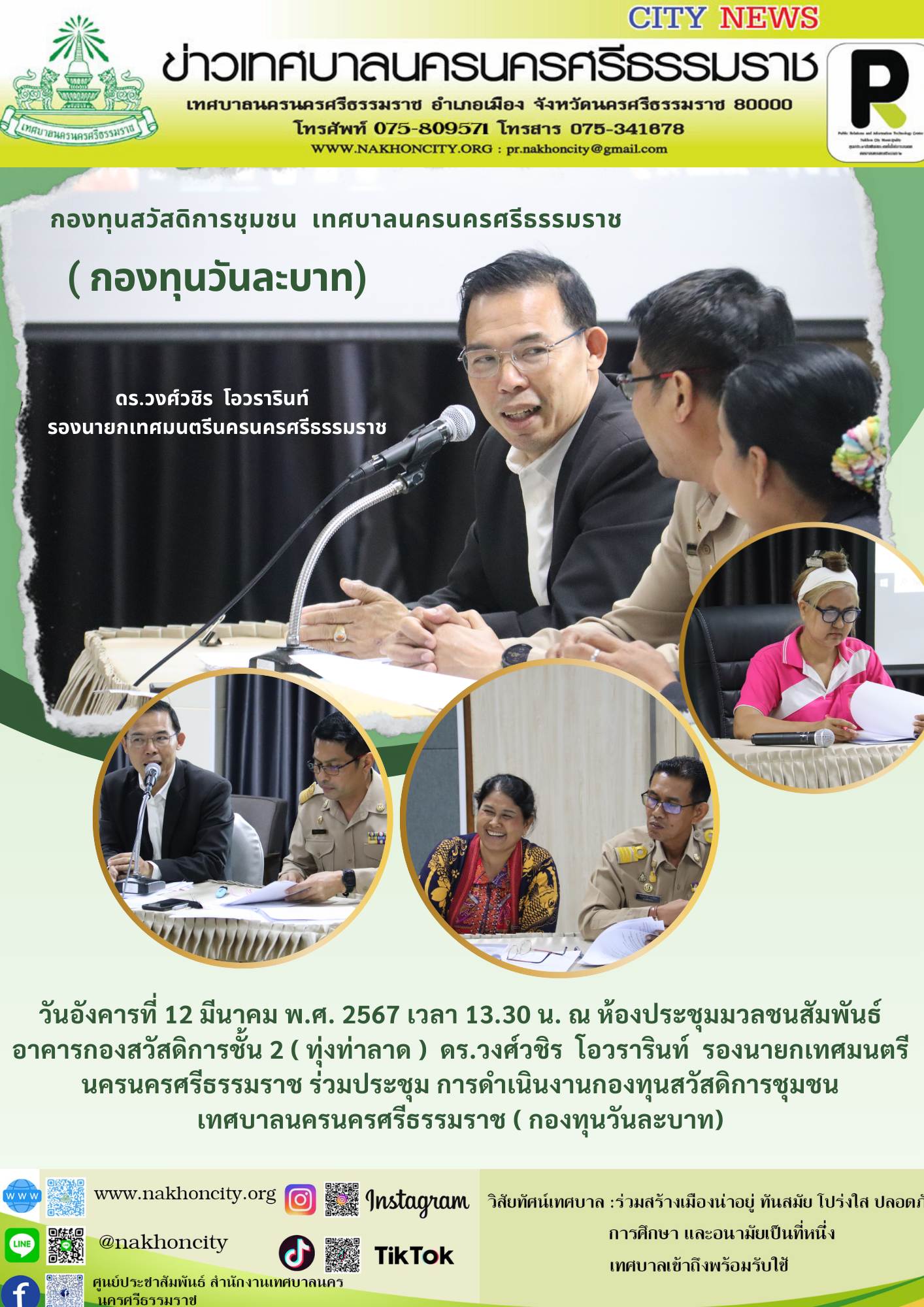 | วันอังคารที่ 12 มีนาคม พ.ศ. 2567 เวลา 13.30 น. ณ ห้องประชุมมวลชนสัมพันธ์ อาคารกองสวัสดิการชั้น 2 ( ทุ่งท่าลาด ) ดร.วงศ์วชิร โอวรารินท์ รองนายกเทศมนตรีนครนครศรีธรรมราช ร่วมประชุม การดำเนินงานกองทุนสวัสดิการชุมชน เทศบาลนครนครศรีธรรมราช ( กองทุนวันละบาท)