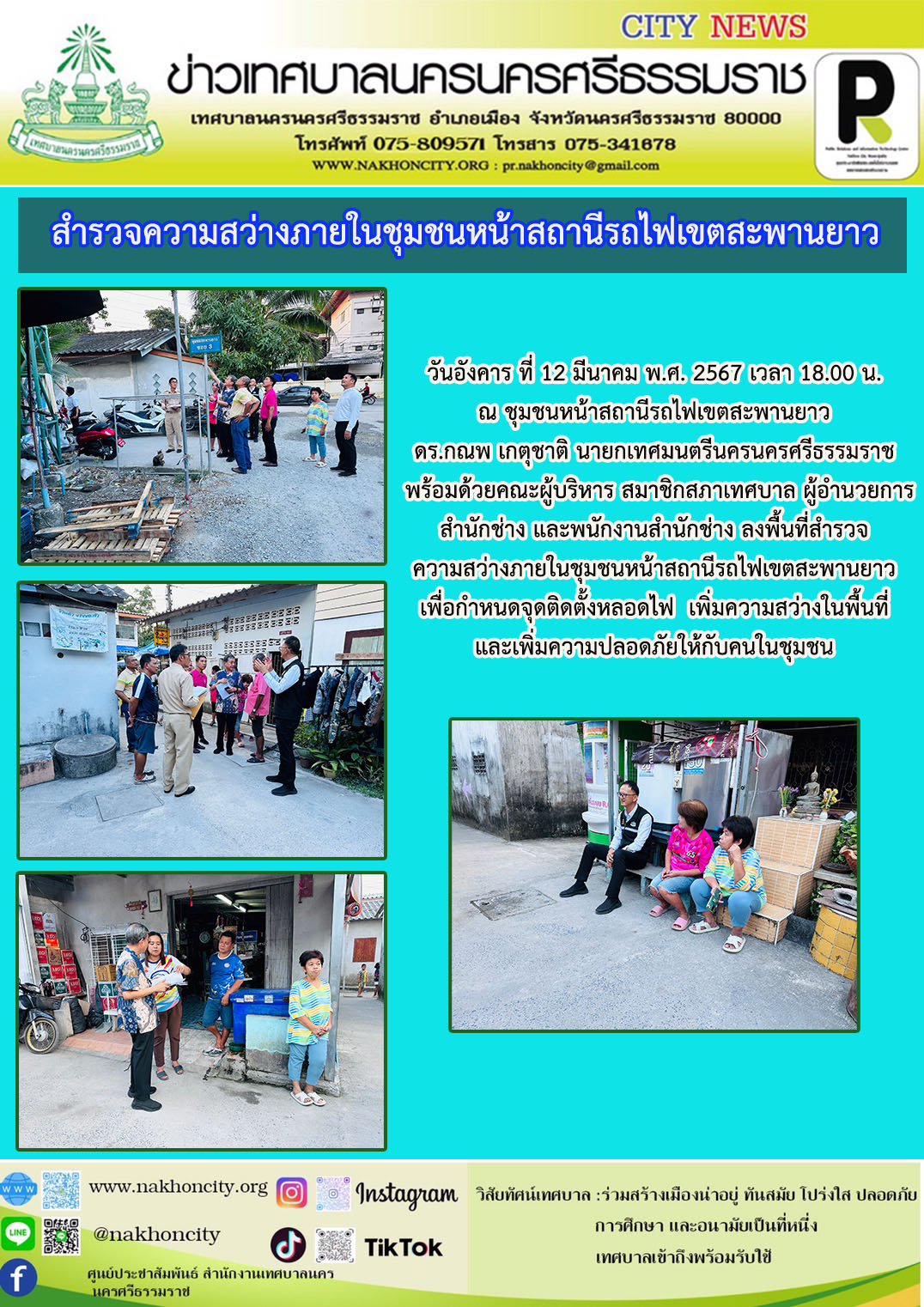 | ดร.กณพ เกตุชาติ นายกเทศมนตรีนครนครศรีธรรมราช พร้อมด้วยคณะผู้บริหาร สมาชิกสภาเทศบาล ผู้อำนวยการสำนักช่าง และพนักงานสำนักช่าง ลงพื้นที่สำรวจความสว่างภายในชุมชนหน้าสถานีรถไฟเขตสะพานยาว เพื่อกำหนดจุดติดตั้งหลอดไฟ เพิ่มความสว่างในพื้นที่ และเพิ่มความปลอดภัยให้กับคนในชุมชน |