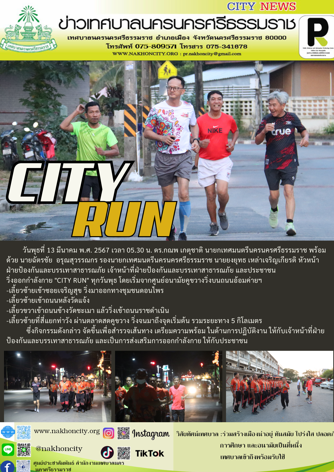 | ดร.กณพ เกตุชาติ นายกเทศมนตรีนครนครศรีธรรมราช นำเจ้าหน้าที่ฝ่ายป้องกันและบรรเทาสาธารณภัย และประชาชน วิ่งออกกำลังกาย "CITY RUN" ทุกวันพุธ |