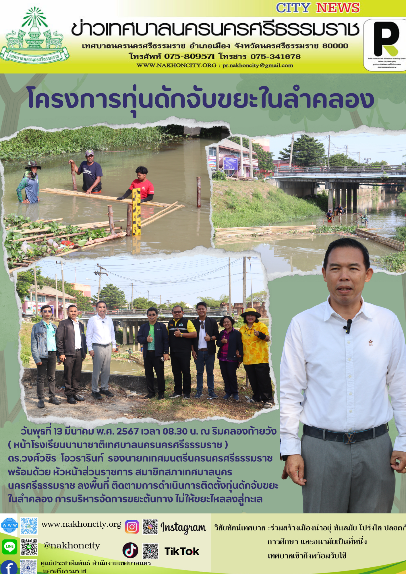 | วันพุธที่ 13 มีนาคม พ.ศ. 2567 เวลา 08.30 น. ณ ริมคลองท้ายวัง ( หน้าโรงเรียนนานาชาติเทศบาลนครนครศรีธรรมราช ) ดร.วงศ์วชิร โอวรารินท์ รองนายกเทศมนตรีนครนครศรีธรรมราช พร้อมด้วย หัวหน้าส่วนราชการ สมาชิกสภาเทศบาลนครนครศรีธรรมราช ลงพื้นที่ ติดตามการดำเนินการติดตั้งทุ่นดักจับขยะในลำคลอง การบริหารจัดการขยะต้นทาง ไม่ให้ขยะไหลลงสู่ทะเล |