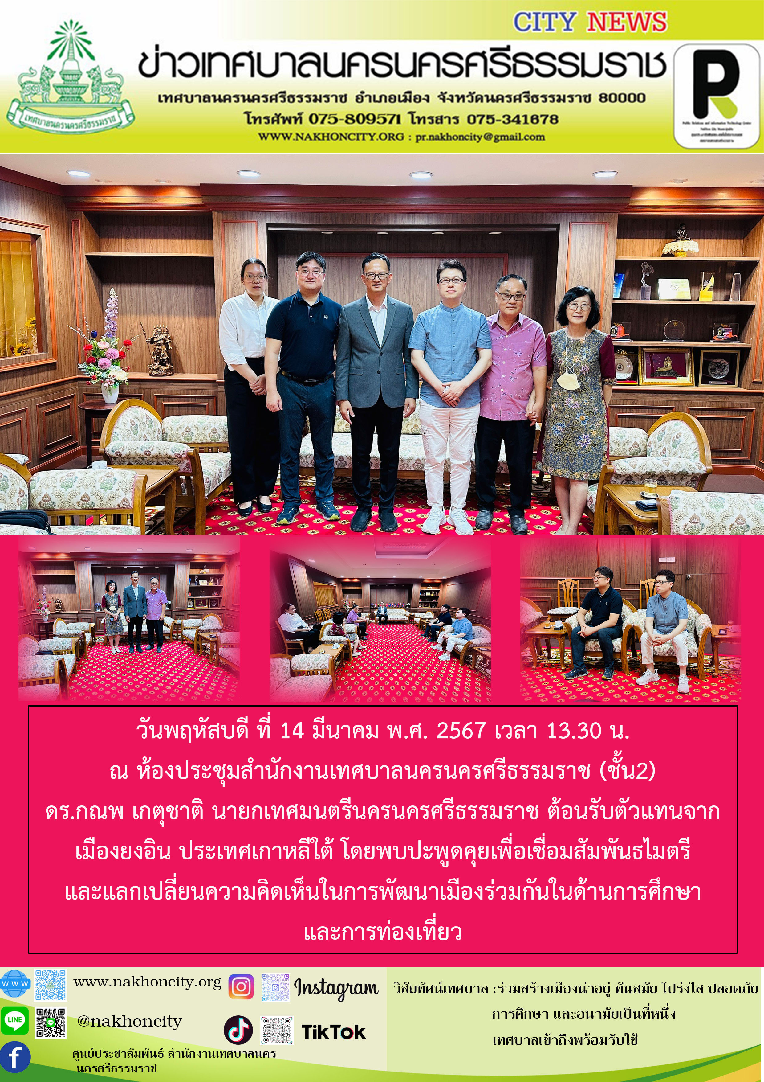 | ดร.กณพ เกตุชาติ นายกเทศมนตรีนครนครศรีธรรมราช ต้อนรับตัวแทนจากเมืองยงอิน ประเทศเกาหลีใต้ โดยพบปะพูดคุยเพื่อเชื่อมสัมพันธไมตรี และแลกเปลี่ยนความคิดเห็นในการพัฒนาเมืองร่วมกันในด้านการศึกษาและการท่องเที่ยว |