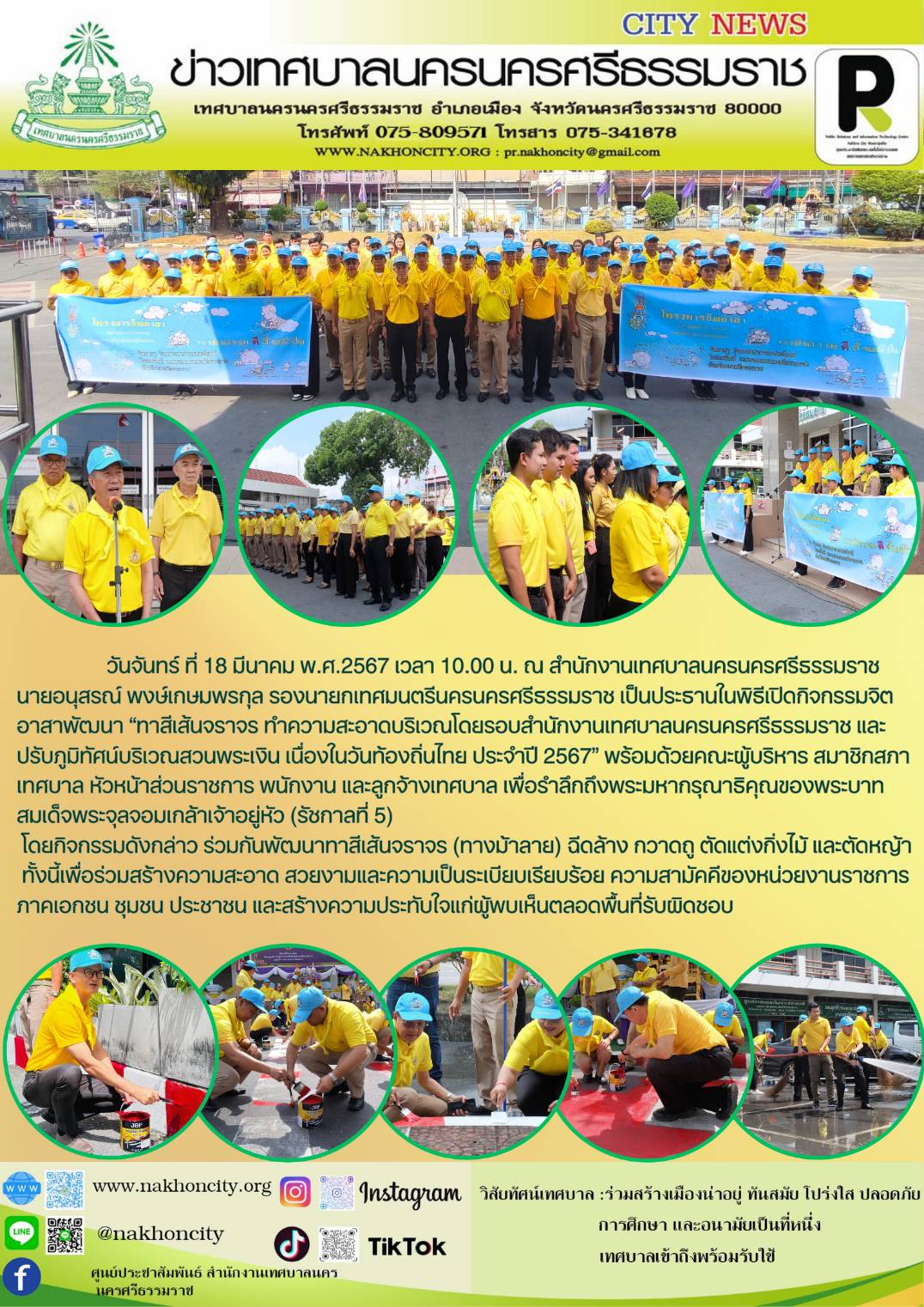 | วันจันทร์ ที่ 18 มีนาคม พ.ศ.2567 เวลา 10.00 น. ณ สำนักงานเทศบาลนครนครศรีธรรมราช นายอนุสรณ์ พงษ์เกษมพรกุล รองนายกเทศมนตรีนครนครศรีธรรมราช เป็นประธานในพิธีเปิดกิจกรรมจิตอาสาพัฒนา “ทาสีเส้นจราจร ทำความสะอาดบริเวณโดยรอบสำนักงานเทศบาลนครนครศรีธรรมราช และปรับภูมิทัศน์บริเวณสวนพระเงิน เนื่องในวันท้องถิ่นไทย ประจำปี 2567” พร้อมด้วยคณะผู้บริหาร สมาชิกสภาเทศบาล หัวหน้าส่วนราชการ พนักงาน และลูกจ้างเทศบาล เพื่อรำลึกถึงพระมหากรุณาธิคุณของพระบาทสมเด็จพระจุลจอมเกล้าเจ้าอยู่หัว (รัชกาลที่ 5) |