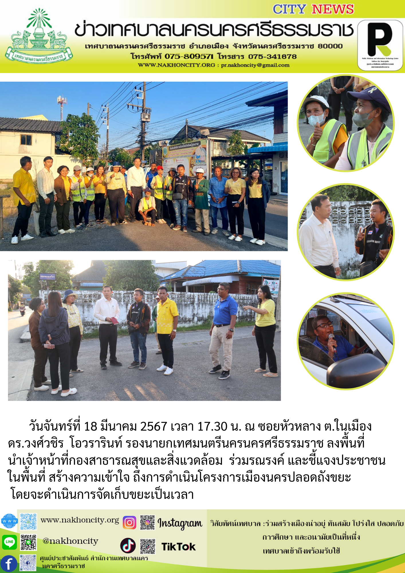 | ดร.วงศ์วชิร โอวรารินท์ รองนายกเทศมนตรีนครนครศรีธรรมราช ลงพื้นที่ นำเจ้าหน้าที่กองสาธารณสุขและสิ่งแวดล้อม ร่วมรณรงค์ และชี้แจงประชาชนในพื้นที่ สร้างความเข้าใจ ถึงการดำเนินโครงการเมืองนครปลอดถังขยะ |