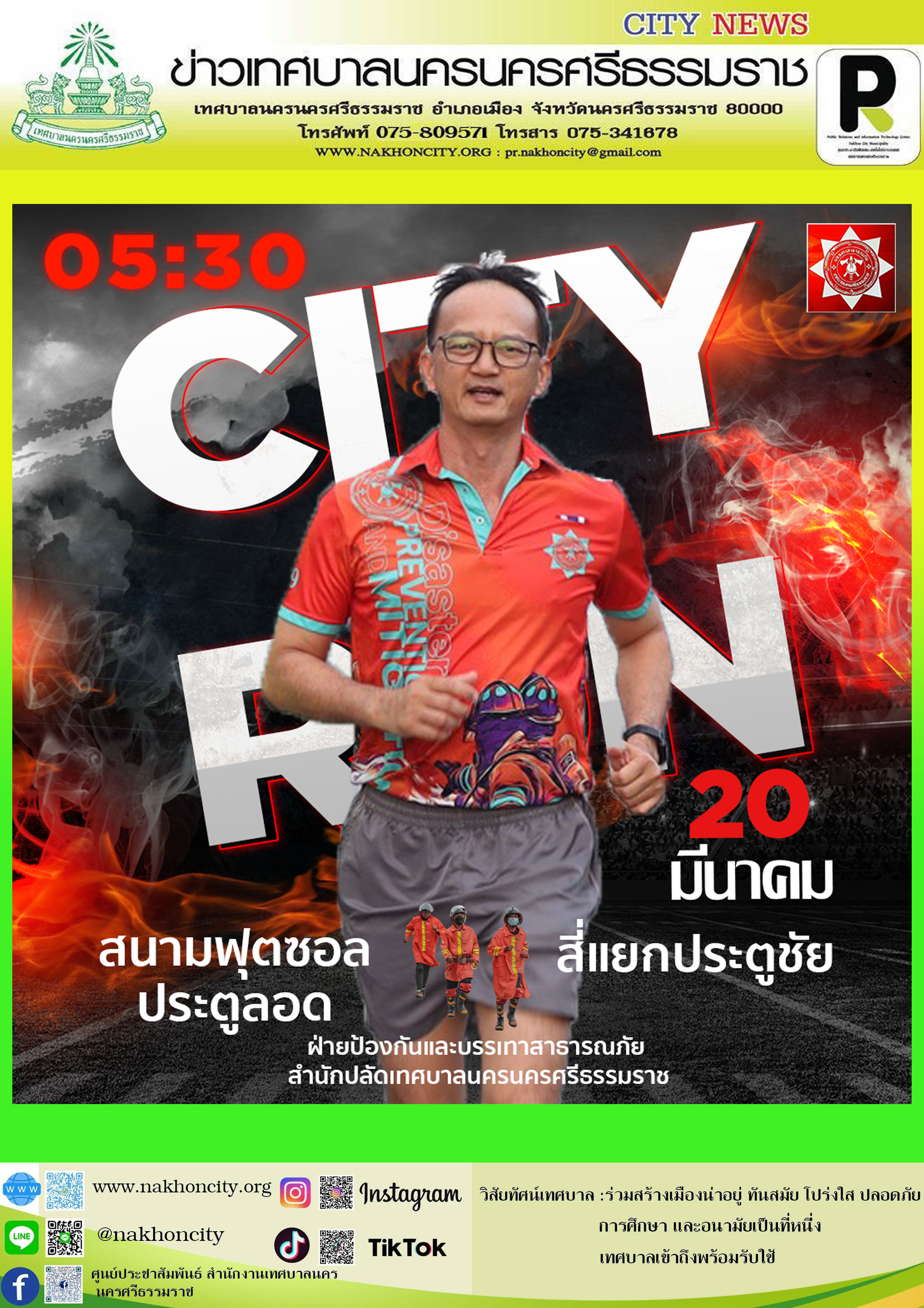 | เทศบาลนครนครศรีธรรมราช ขอเชิญประชาชนร่วมกิจกรรม วิ่ง “City Run” วันพุธ วันพุธที่ 20 มีนาคม พ.ศ.2567 เวลา 05.30 น. ณ จุดนัดพบ สนามฟุตซอลประตูลอด เทศบาลนครนครศรีธรรมราช ภายใต้การบริหารงานโดย ดร.กณพ เกตุชาติ นายกเทศมนตรีนครนครศรีธรรมราช เล็งเห็นถึงความสำคัญในการพัฒนาบุคลากร และส่งเสริมคุณภาพชีวิตประชาชนในด้านการส่งเสริมการออกกำลังกาย จึงจัดกิจกรรม วิ่ง “City Run” วันพุธ เวลา 05.30 น. เพื่อให้บุคลากร เจ้าหน้าที่ฝ่ายป้องกันและบรรเทาสาธารณภัย ได้สำรวจพื้นที่เพื่อเตรียมความพร้อมสำหรับการปฏิบัติงาน รวมถึงให้ประชาชนได้เข้าร่วมกิจกรรมการออกกำลังกายร่วมกับเจ้าหน้าที่ โดยในวันพุธที่ 20 มีนาคม พ.ศ.2567 กำหนดเส้นทางวิ่ง ดังนี้ เวลา 05.30 น. ณ จุดนัดพบ พร้อมกันที่พร้อมกันที่สนามฟุตซอลประตูลอด วิ่งไปทางสี่แยกศาลากลางเลี้ยวซ้ายเข้าถนนราชดำเนิน วิ่งบนถนนราชดำเนินไปเลี้ยวซ้ายที่สี่แยกประตูชัย ออกถนนศรีธรรมโศก เลี้ยวขวาเข้าซอยศรีธรรมโศก 1 เลี้ยวซ้ายวิ่งบนถนนพัฒนาการคูขวาง จนมาถึงสนามฟุตซอลประตูลอด จึงขอเชิญชวนประชาชนผู้สนใจร่วมวิ่งออกกำลังกาย “City Run” วันพุธ ร่วมกับคณะผู้บริหารและเจ้าหน้าที่เทศบาลนครนครศรีธรรมราช สอบถามรายละเอียดเพิ่มเติมได่ที่ ฝ่ายป้องกันและบรรเทาสาธารณภัย สำนักปลัดเทศบาล โทรศัพท์ 075-809571 ต่อ 9138 หรือ 075-348118 |