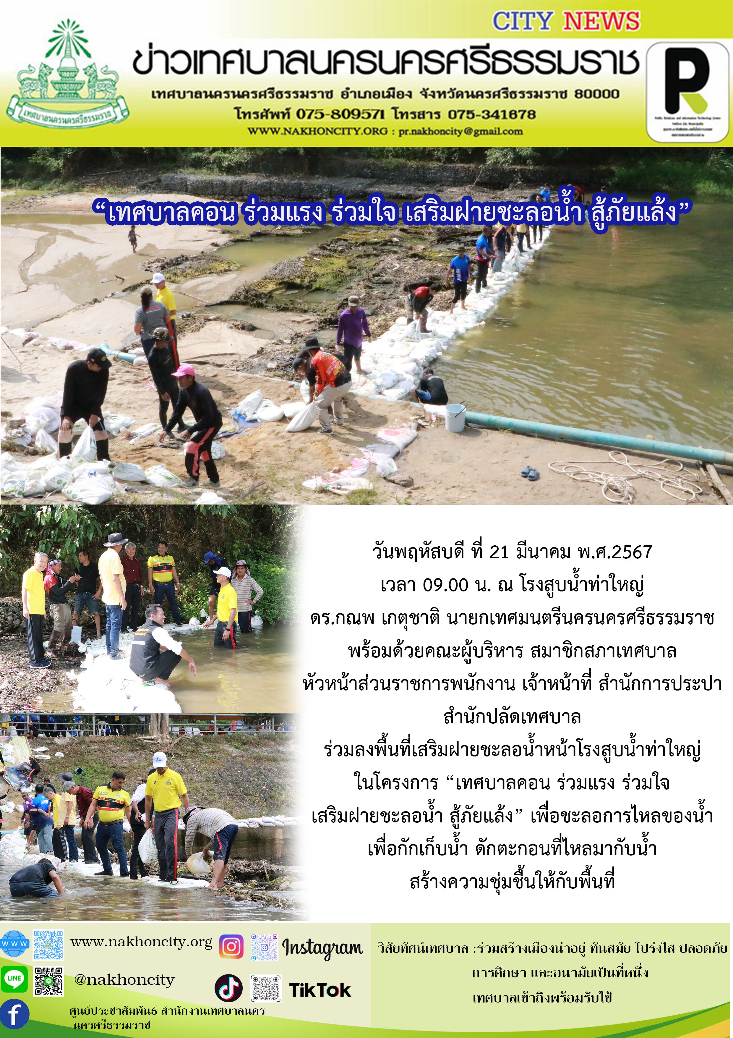 | ดร.กณพ เกตุชาติ นายกเทศมนตรีนครนครศรีธรรมราชพร้อมด้วยคณะผู้บริหาร สมาชิกสภาเทศบาล หัวหน้าส่วนราชการพนักงาน เจ้าหน้าที่ สำนักการประปา สำนักปลัดเทศบาล ร่วมลงพื้นที่เสริมฝายชะลอน้ำหน้าโรงสูบน้ำท่าใหญ่ ในโครงการ “เทศบาลคอน ร่วมแรง ร่วมใจ เสริมฝายชะลอน้ำ สู้ภัยแล้ง” |
