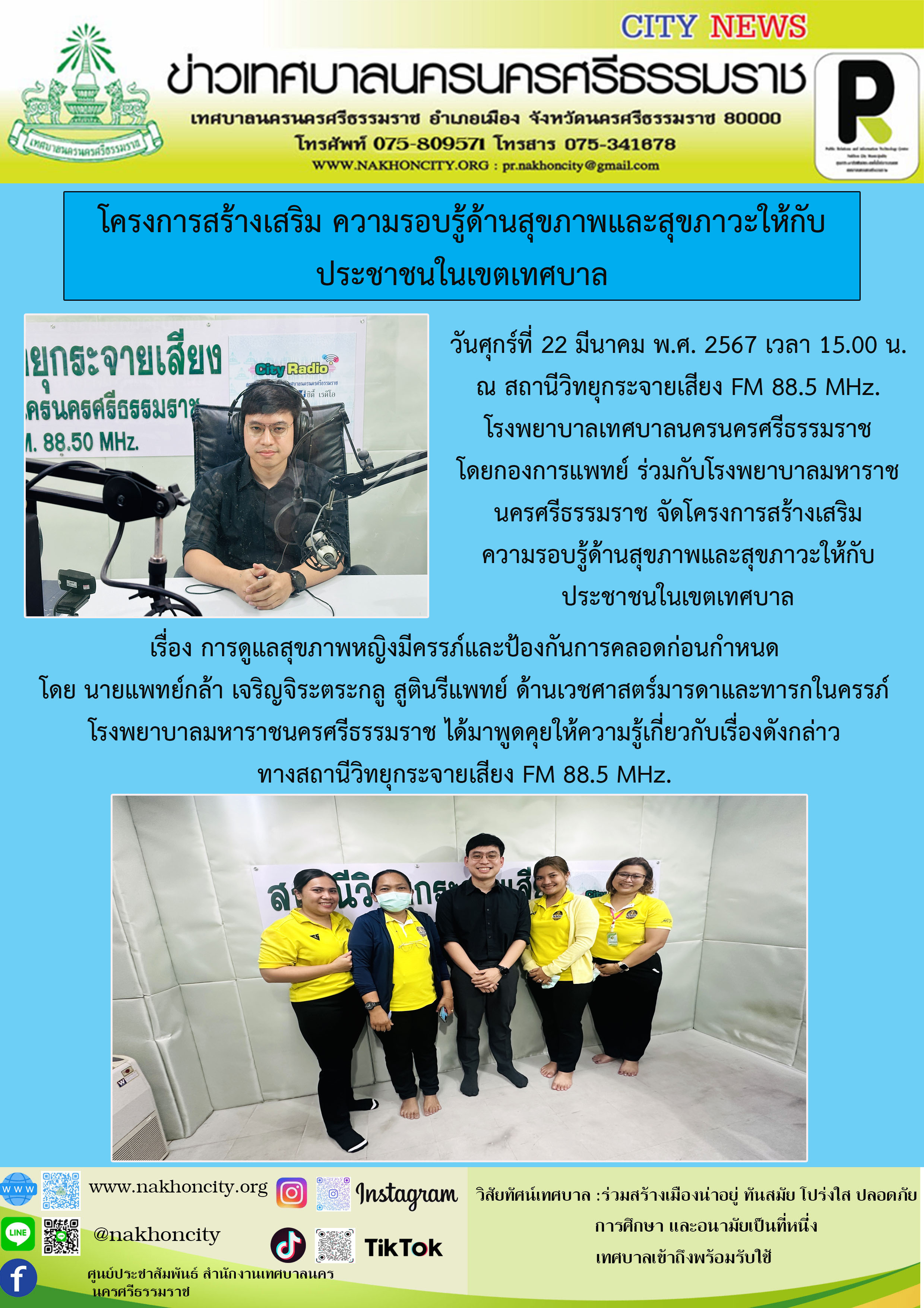 | โรงพยาบาลเทศบาลนครนครศรีธรรมราช โดยกองการแพทย์ ร่วมกับโรงพยาบาลมหาราชนครศรีธรรมราช จัดโครงการสร้างเสริมความรอบรู้ด้านสุขภาพและสุขภาวะให้กับประชาชนในเขตเทศบาล เรื่อง การดูแลสุขภาพหญิงมีครรภ์และป้องกันการคลอดก่อนกำหนด |
