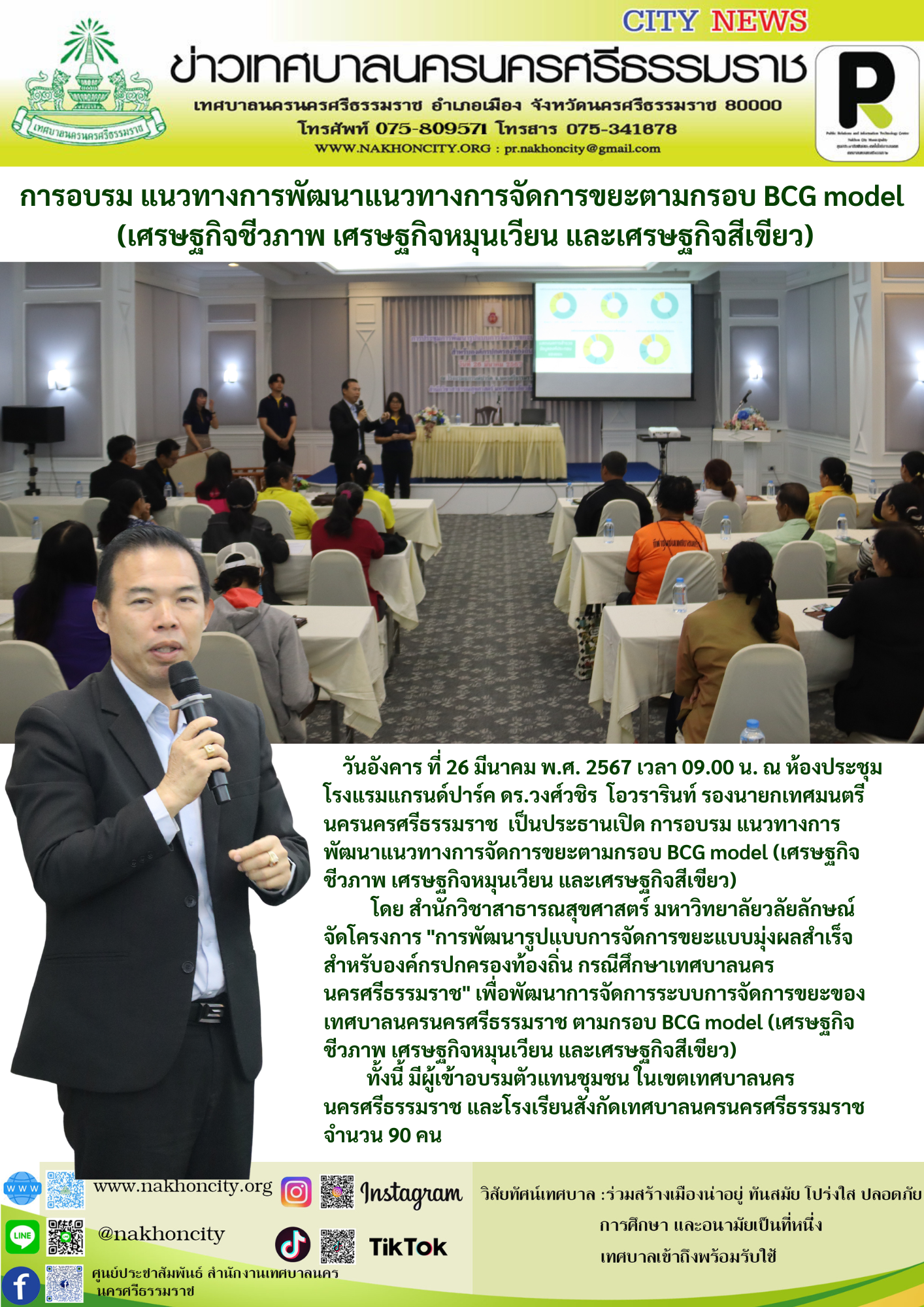 | วันอังคาร ที่ 26 มีนาคม พ.ศ. 2567 เวลา 09.00 น. ณ ห้องประชุม โรงแรมแกรนด์ปาร์ค ดร.วงศ์วชิร โอวรารินท์ รอง นายกเทศมนตรีนครนครศรีธรรมราช เป็นประธานเปิด การอบรม แนวทางการพัฒนาแนวทางการจัดการขยะตามกรอบ BCG model (เศรษฐกิจชีวภาพ เศรษฐกิจหมุนเวียน และเศรษฐกิจสีเขียว) โดย สำนักวิชาสาธารณสุขศาสตร์ มหาวิทยาลัยวลัยลักษณ์ จัดโครงการ "การพัฒนารูปแบบการจัดการขยะแบบมุ่งผลสำเร็จสำหรับองค์กรปกครองท้องถิ่น กรณีศึกษาเทศบาลนครนครศรีธรรมราช" เพื่อพัฒนาการจัดการระบบการจัดการขยะของเทศบาลนครนครศรีธรรมราช ตามกรอบ BCG model (เศรษฐกิจชีวภาพ เศรษฐกิจหมุนเวียน และเศรษฐกิจสีเขียว) ทั้งนี้ มีผู้เข้าอบรมตัวแทนชุมชน ในเขตเทศบาลนครนครศรีธรรมราช และโรงเรียนสังกัดเทศบาลนครนครศรีธรรมราช จำนวน 90 คน