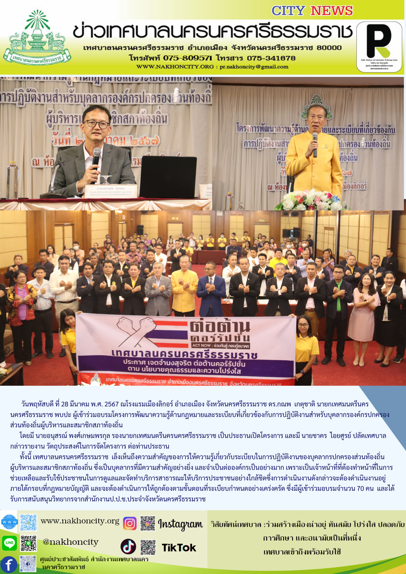 | ดร.กณพ เกตุชาติ นายกเทศมนตรีนครนครศรีธรรมราช พบปะ ผู้เข้าร่วมอบรมโครงการพัฒนาความรู้ด้านกฎหมายและระเบียบที่เกี่ยวข้องกับการปฎิบัติงานสำหรับบุคลากรองค์กรปกครองส่วนท้องถิ่นผู้บริหารและสมาชิกสภาท้องถิ่น |