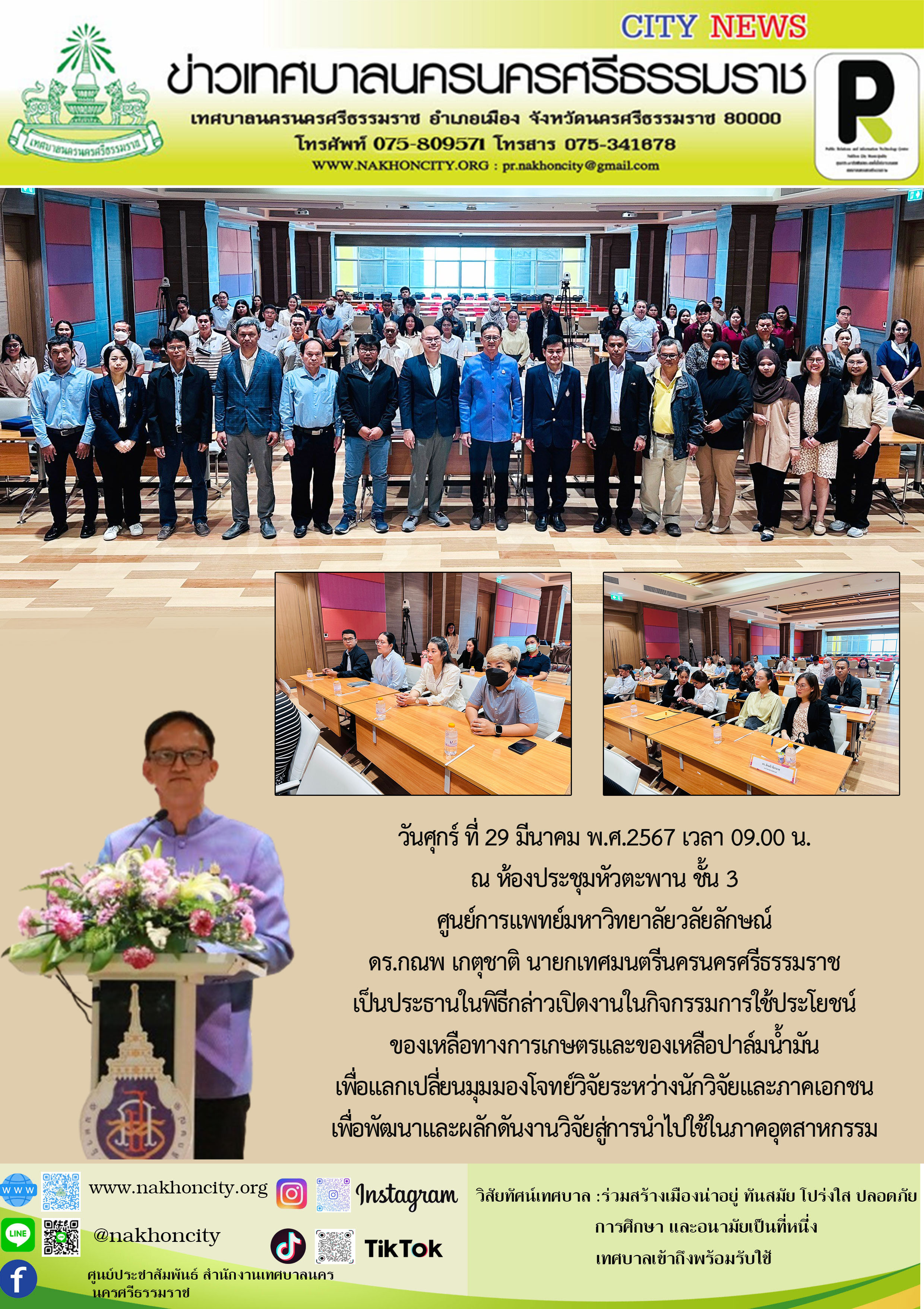 | ดร.กณพ เกตุชาติ นายกเทศมนตรีนครนครศรีธรรมราชเป็นประธานในพิธีกล่าวเปิดงานในกิจกรรมการใช้ประโยชน์ของเหลือทางการเกษตรและของเหลือปาล์มน้ำมัน |