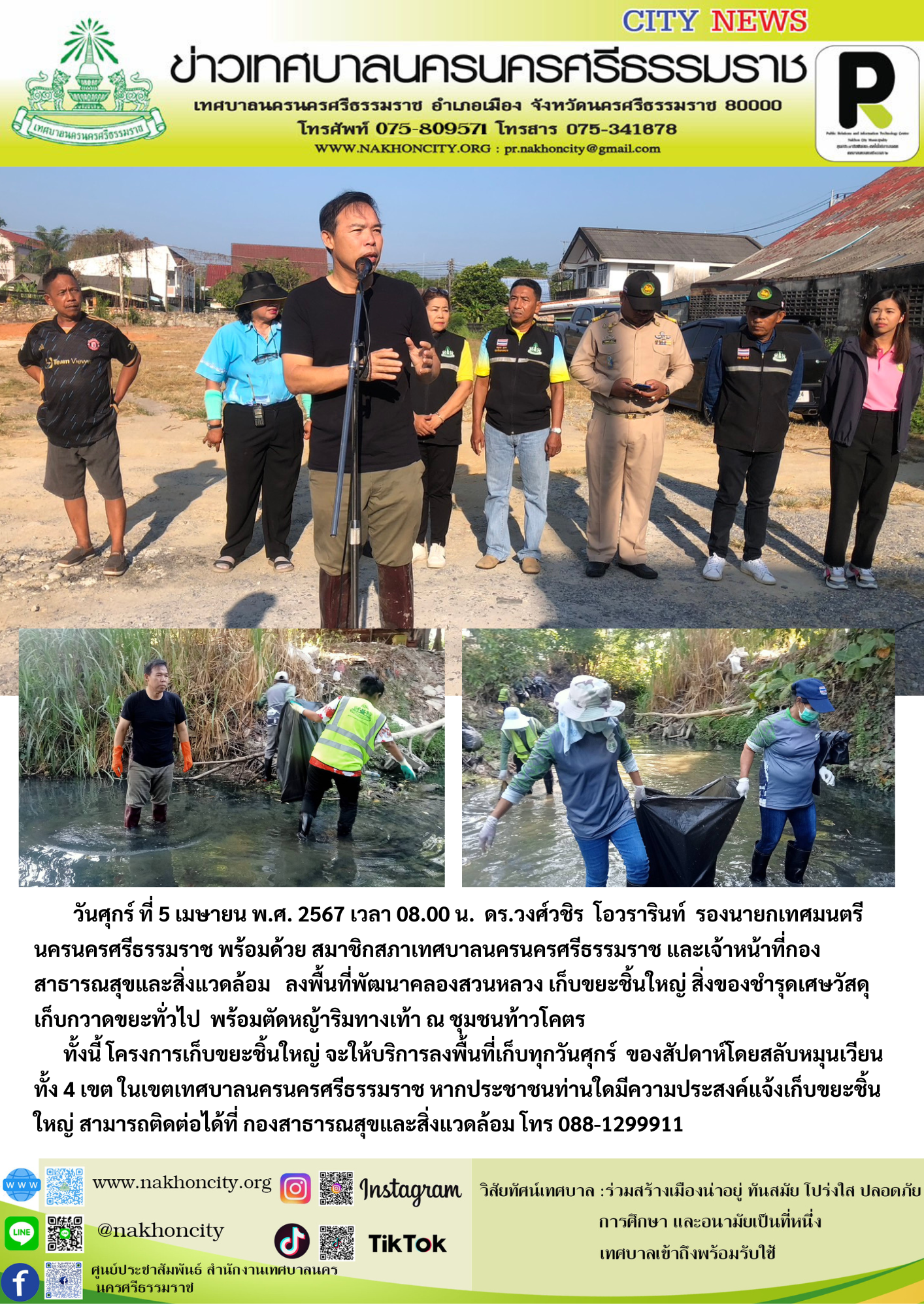 | ดร.วงศ์วชิร โอวรารินท์ รองนายกเทศมนตรีนครนครศรีธรรมราช พร้อมด้วย สมาชิกสภาเทศบาลนครนครศรีธรรมราช และเจ้าหน้าที่กองสาธารณสุขและสิ่งแวดล้อม ลงพื้นที่ เก็บขยะสิ้นใหญ่ ชุมชนท้าวโคตร |