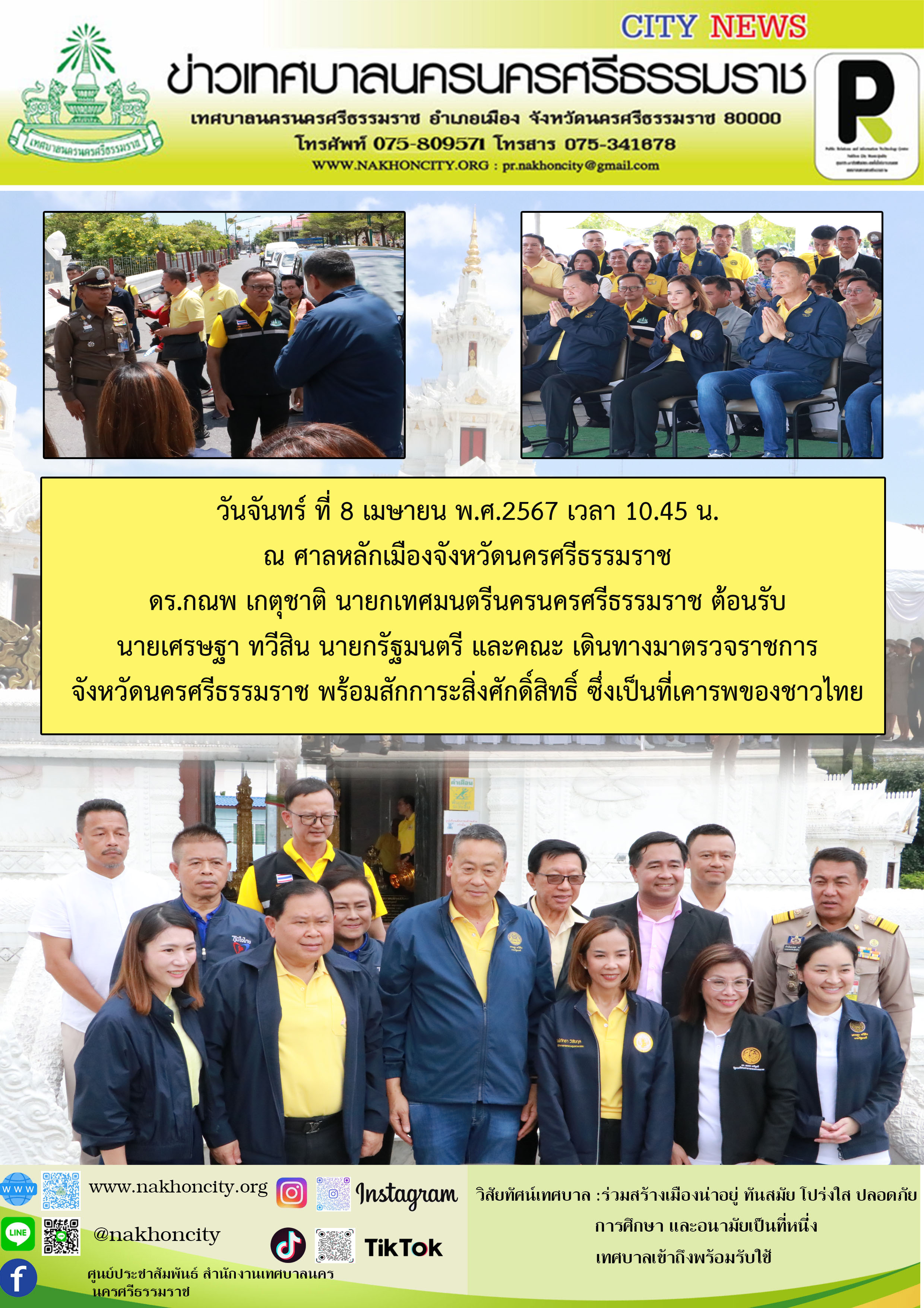 | ดร.กณพ เกตุชาติ นายกเทศมนตรีนครนครศรีธรรมราช ต้อนรับนายเศรษฐา ทวีสิน นายกรัฐมนตรี และคณะ เดินทางมาตรวจราชการ จังหวัดนครศรีธรรมราช พร้อมสักการะสิ่งศักดิ์สิทธิ์ |