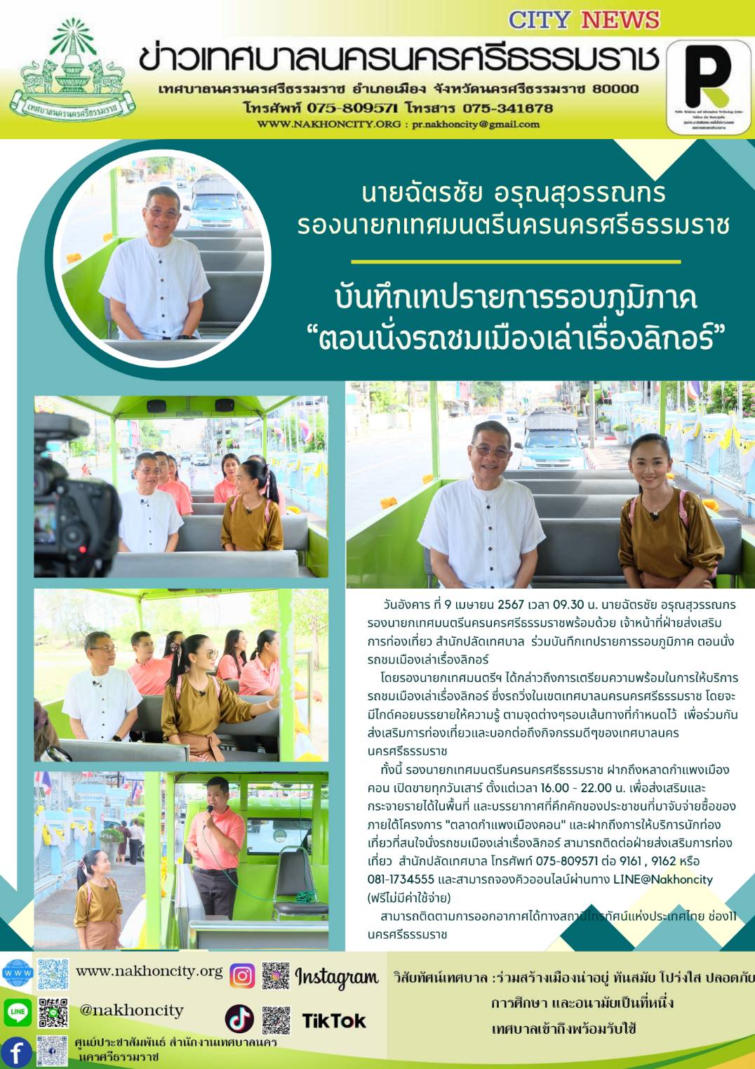 | วันอังคาร ที่ 9 เมษายน 2567 เวลา 09.30 น. นายฉัตรชัย อรุณสุวรรณกร รองนายกเทศมนตรีนครนครศรีธรรมราช พร้อมด้วย เจ้าหน้าที่ฝ่ายส่งเสริมการท่องเที่ยว สำนักปลัดเทศบาล ร่วมบันทึกเทปรายการรอบภูมิภาค ตอนนั่งรถชมเมืองเล่าเรื่องลิกอร์ โดยรองนายกเทศมนตรีฯ ได้กล่าวถึงการเตรียมความพร้อมในการให้บริการรถชมเมืองเล่าเรื่องลิกอร์ ซึ่งรถวิ่งในเขตเทศบาลนครนครศรีธรรมราช โดยจะมีไกด์คอยบรรยายให้ความรู้ ตามจุดต่างๆรอบเส้นทางที่กำหนดไว้ เพื่อร่วมกันส่งเสริมการท่องเที่ยวและบอกต่อถึงกิจกรรมดีๆของเทศบาลนครนครศรีธรรมราช ทั้งนี้ รองนายกเทศมนตรีนครนครศรีธรรมราช ฝากถึงหลาดกำแพงเมืองคอน เปิดขายทุกวันเสาร์ ตั้งแต่เวลา 16.00 - 22.00 น. เพื่อส่งเสริมและกระจายรายได้ในพื้นที่ และบรรยากาศที่คึกคักของประชาชนที่มาจับจ่ายซื้อของ ภายใต้โครงการ "ตลาดกำแพงเมืองคอน" และฝากถึงการให้บริการนักท่องเที่ยวที่สนใจนั่งรถชมเมืองเล่าเรื่องลิกอร์ สามารถติดต่อฝ่ายส่งเสริมการท่องเที่ยว สำนักปลัดเทศบาล โทรศัพท์ 075-809571 ต่อ 9161 , 9162 หรือ 081-1734555 และสามารถจองคิวออนไลน์ผ่านทาง LINE@Nakhoncity (ฟรีไม่มีค่าใช้จ่าย) สามารถติดตามการออกอากาศได้ทางสถานีโทรทัศน์แห่งประเทศไทย ช่อง11 นครศรีธรรมราช …………….. ภาพ//ข่าว//จันทร์จิรา |