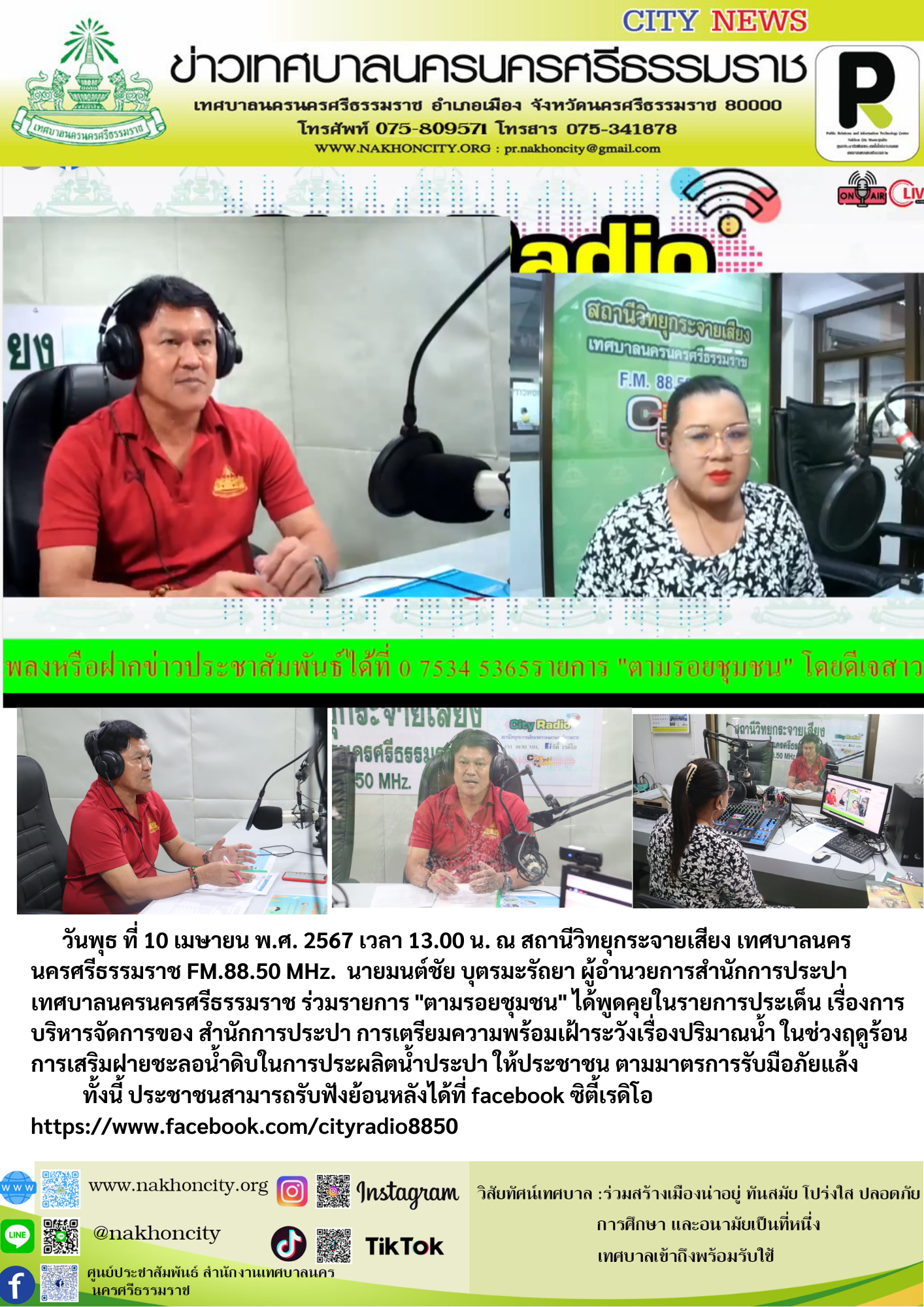 | วันพุธ ที่ 10 เมษายน พ.ศ. 2567 เวลา 13.00 น. ณ สถานีวิทยุกระจายเสียง เทศบาลนครนครศรีธรรมราช FM.88.50 MHz. นายมนต์ชัย บุตรมะรัถยา ผู้อำนวยการสำนักการประปาเทศบาลนครนครศรีธรรมราช ร่วมรายการ "ตามรอยชุมชน" ได้พูดคุยในรายการประเด็น เรื่องการบริหารจัดการของ สำนักการประปา การเตรียมความพร้อมเฝ้าระวังเรื่องปริมาณน้ำ ในช่วงฤดูร้อน การเสริมฝายชะลอน้ำดิบในการประผลิตน้ำประปา ให้ประชาชน ตามมาตรการรับมือภัยแล้ง ทั้งนี้ ประชาชนสามารถรับฟังย้อนหลังได้ที่ facebook ซิตี้เรดิโอ https://www.facebook.com/cityradio8850