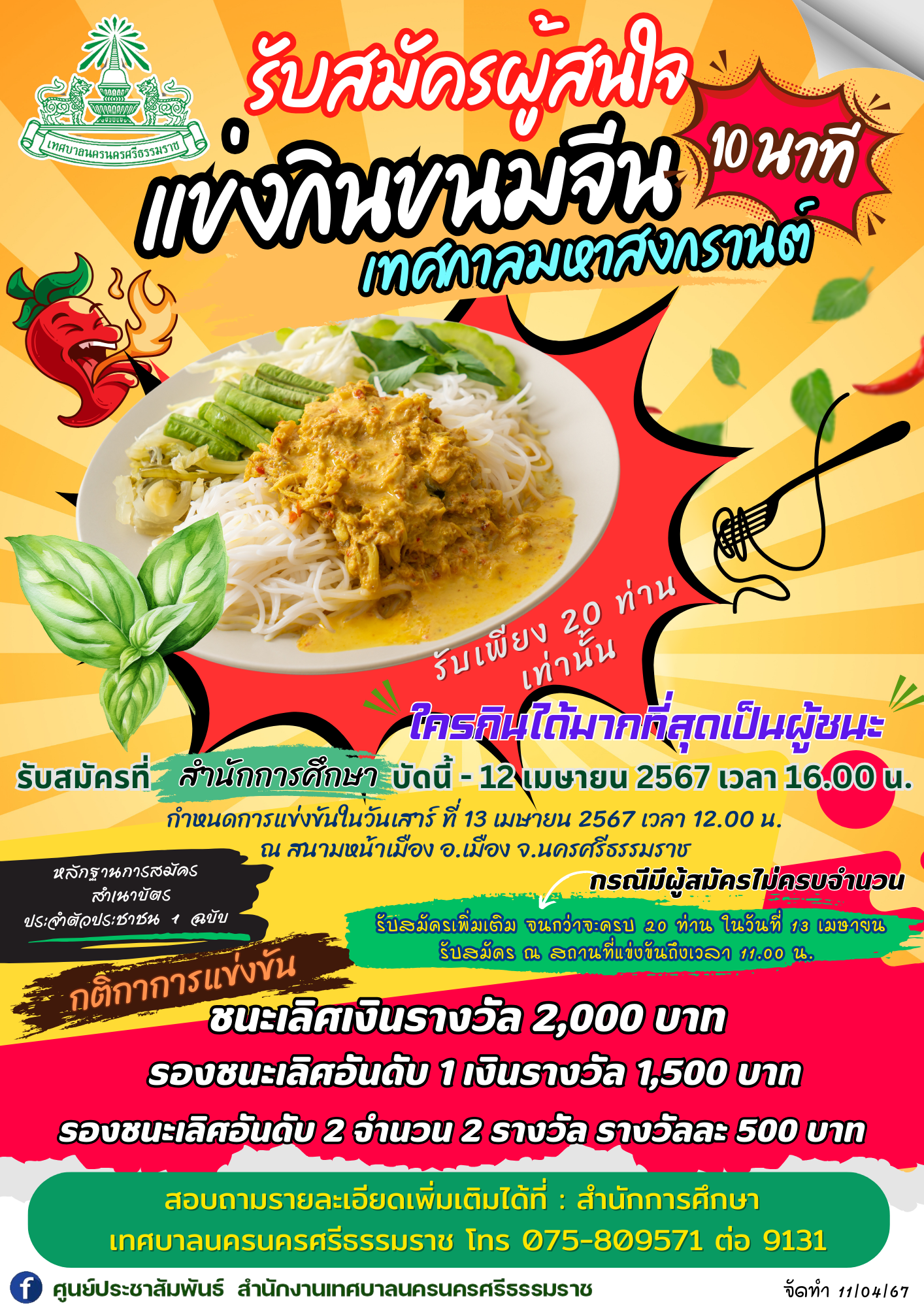 | เทศบาลนครนครศรีธรรมราช รับสมัครผู้สนใจ แข่งขันกินขนมจีน ในงานเทศกาลมหาสงกรานต์ ประจำปี พ.ศ.2567 |