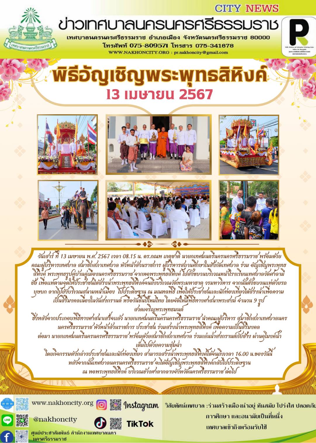| ดร.กณพ เกตุชาติ นายกเทศมนตรีนครนครศรีธรรมราช พร้อมด้วย คณะผู้บริหารเทศบาล สมาชิกสภาเทศบาล หัวหน้าส่วนราชการ ผู้บริหารสถานศึกษาในสังกัดเทศบาล ร่วม อัญเชิญพระพุทธสิหิงค์ พระพุทธรูปคู่บ้านคู่เมืองนครศรีธรรมราช |