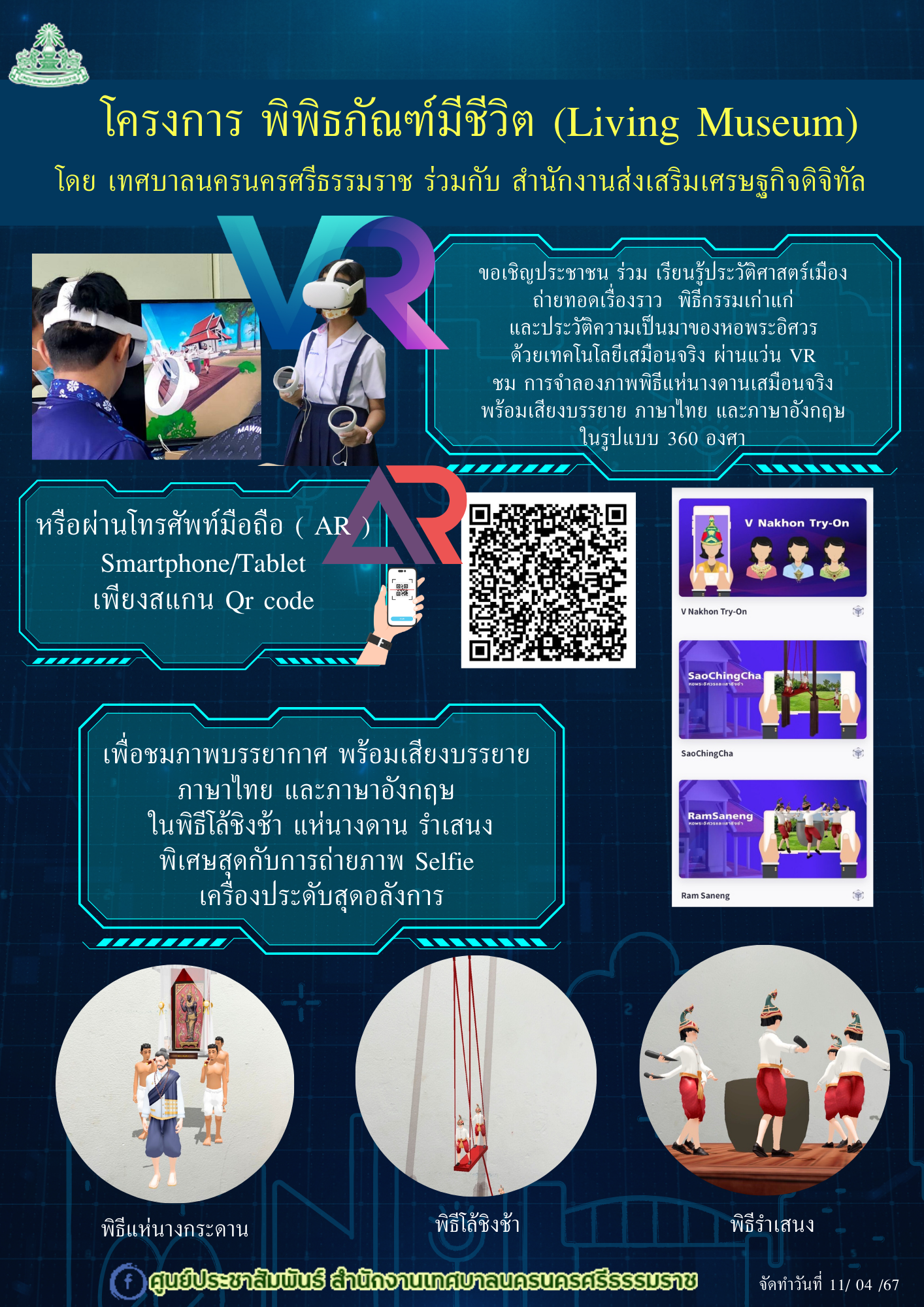 | โครงการ พิพิธภัณฑ์มีชีวิต (Living Museum) โดย เทศบาลนครนครศรีธรรมราช ร่วมกับ สำนักงานส่งเสริมเศรษฐกิจดิจิทัล ขอเชิญประชาชน ร่วม เรียนรู้ประวัติศาสตร์เมือง ถ่ายทอดเรื่องราว พิธีกรรมเก่าแก่ และประวัติความเป็นมาของหอพระอิศวร ด้วยเทคโนโลยีเสมือนจริง ผ่านแว่น VR ชม การจำลองภาพพิธีแห่นางดานเสมือนจริง พร้อมเสียงบรรยาย ภาษาไทย และภาษาอังกฤษ ในรูปแบบ 360 องศา หรือผ่านโทรศัพท์มือถือ ( AR ) Smartphone/Tablet เพียงสแกน Qr code เพื่อชมภาพบรรยากาศ พร้อมเสียงบรรยาย ภาษาไทย และภาษาอังกฤษ ในพิธีโล้ชิงช้า แห่นางดาน รำเสนง พิเศษสุดกับการถ่ายภาพ Selfie เครื่องประดับสุดอลังการ |