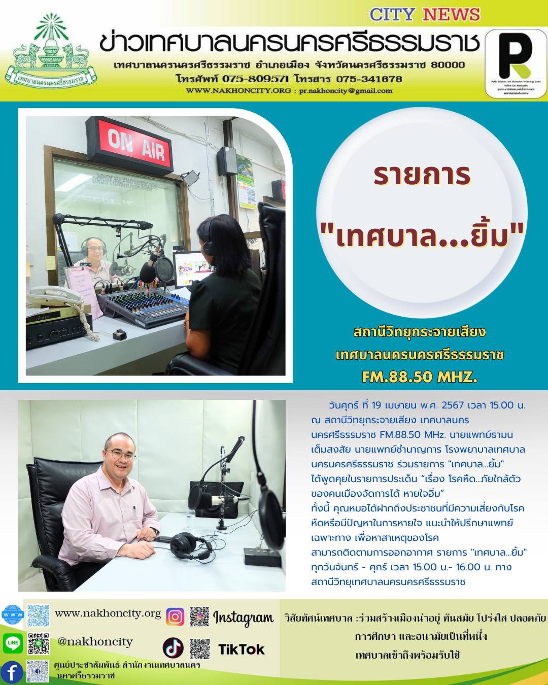 | วันศุกร์ ที่ 19 เมษายน พ.ศ. 2567 เวลา 15.00 น.ณ สถานีวิทยุกระจายเสียง เทศบาลนครนครศรีธรรมราช FM.88.50 MHz. นายแพทย์ธามน เต็มสงสัย นายแพทย์ชำนาญการ โรงพยาบาลเทศบาลนครนครศรีธรรมราช ร่วมรายการ "เทศบาล...ยิ้ม" ได้พูดคุยในรายการประเด็น “เรื่อง โรคหืด...ภัยใกล้ตัวของคนเมืองจัดการได้ หายใจอิ่ม” ทั้งนี้ คุณหมอได้ฝากถึงประชาชนที่มีความเสี่ยงกับโรคหืดหรือมีปัญหาในการหายใจ แนะนำให้ปรึกษาแพทย์เฉพาะทาง เพื่อหาสาเหตุของโรค สามารถติดตามการออกอากาศ รายการ "เทศบาล...ยิ้ม" ทุกวันจันทร์ - ศุกร์ เวลา 15.00 น.- 16.00 น. ทางสถานีวิทยุเทศบาลนครนครศรีธรรมราช |