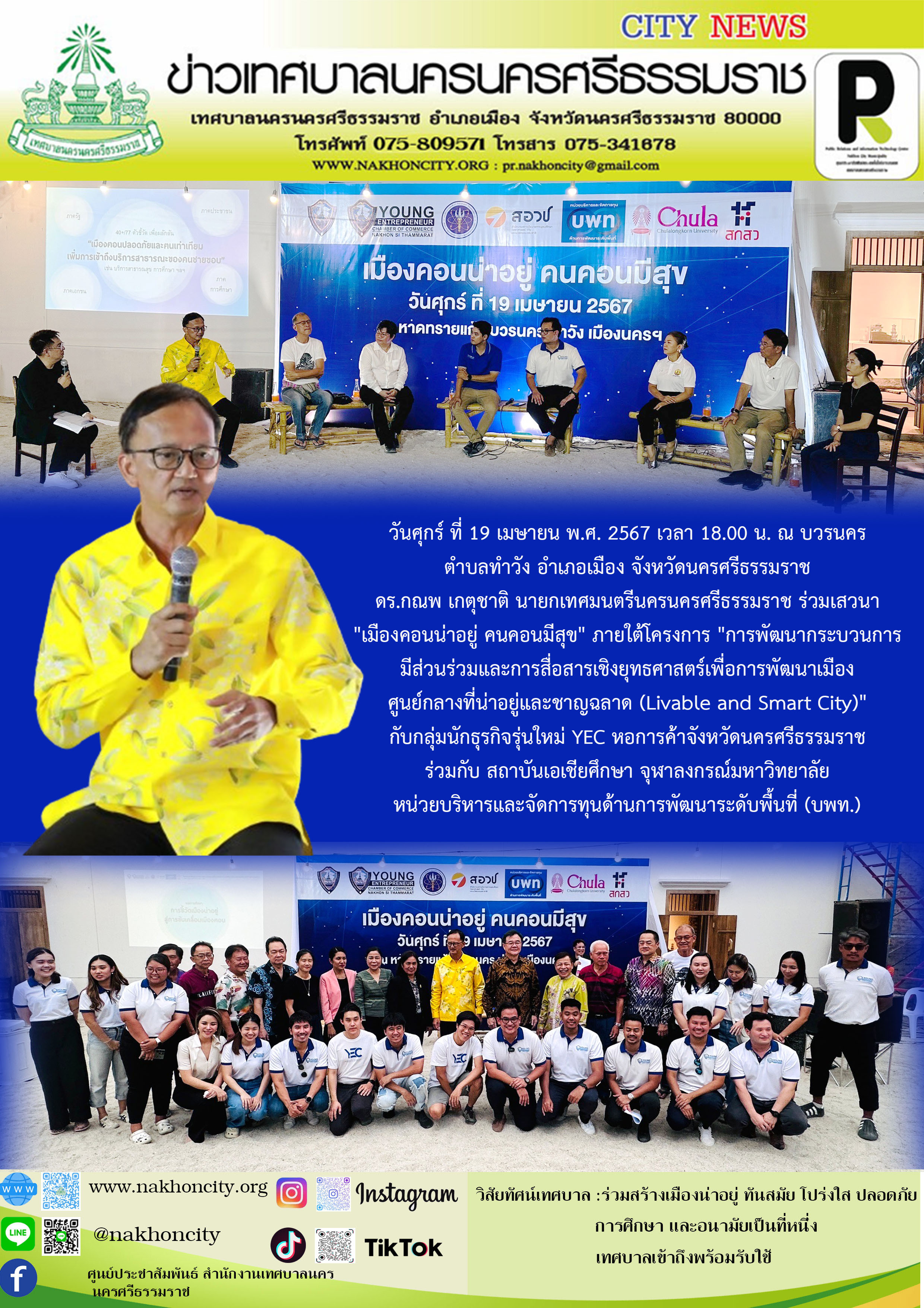 | ดร.กณพ เกตุชาติ นายกเทศมนตรีนครนครศรีธรรมราชร่วมเสวนา "เมืองคอนน่าอยู่ คนคอนมีสุข" ภายใต้โครงการ "การพัฒนากระบวนการมีส่วนร่วมและการสื่อสารเชิงยุทธศาสตร์เพื่อการพัฒนาเมืองศูนย์กลางที่น่าอยู่และชาญฉลาด (Livable and Smart City)" |